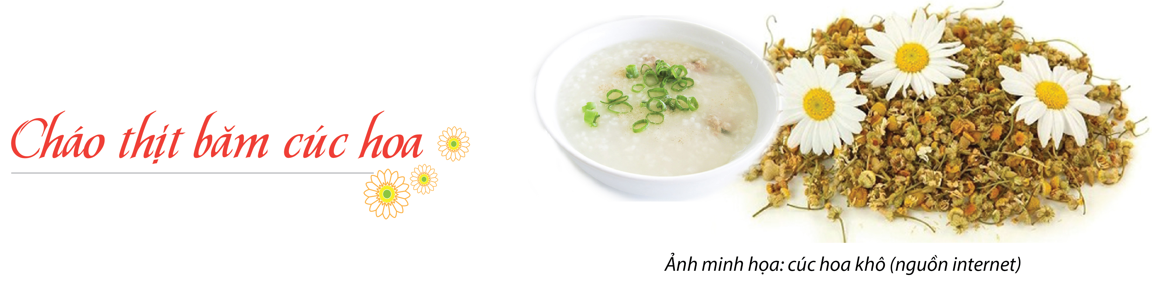  Cách chế biến: Rửa sạch cúc hoa, thịt nạc băm nhỏ, đãi gạo sạch cùng thịt nạc bỏ vào nồi cùng khoảng 2 lít nước, nấu lửa nhỏ đến nhừ, cho cúc hoa vào nấu thêm 2 phút là được, nêm nếm gia vị.