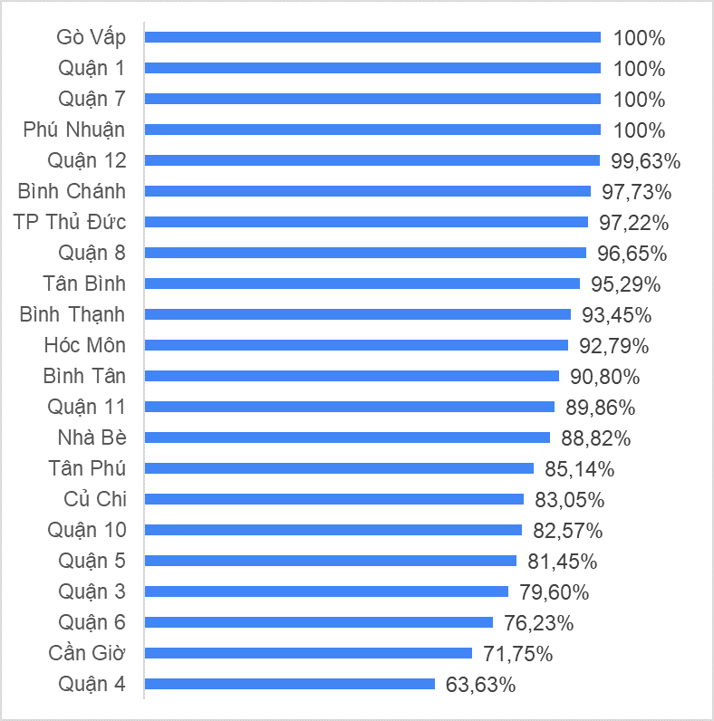 Hình: Tỷ lệ tiêm vắc xin sởi ở nhóm trẻ 1 - 10 tuổi so với kế hoạch theo địa bàn quận, huyện (tính đến hết ngày 29/9/2024)