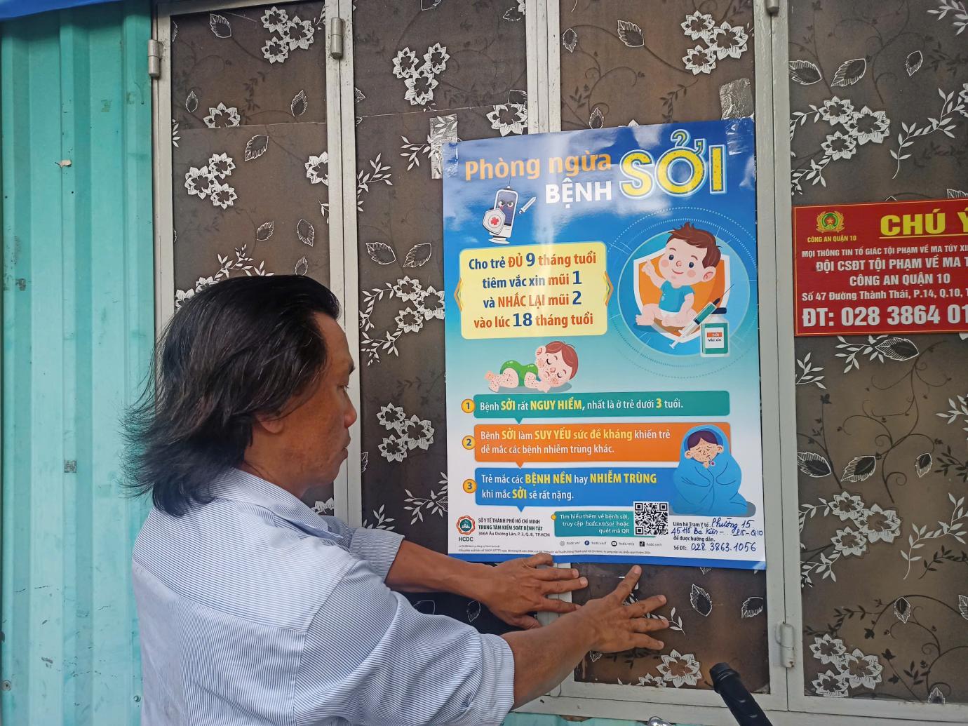 Ảnh: Cộng tác viên sức khỏe cộng đồng tham gia dán bích chương truyền thông phòng ngừa bệnh sởi trên địa bàn Quận 10