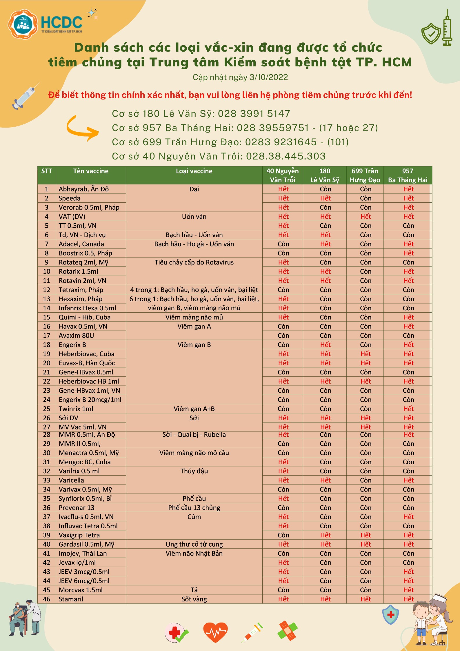 Danh sách các loại vắc-xin đang được tổ chức tiêm chủng tại Trung tâm Kiểm soát bệnh tật TP. Hồ Chí Minh (cập nhật 7:00 giờ ngày 3/10/2022)