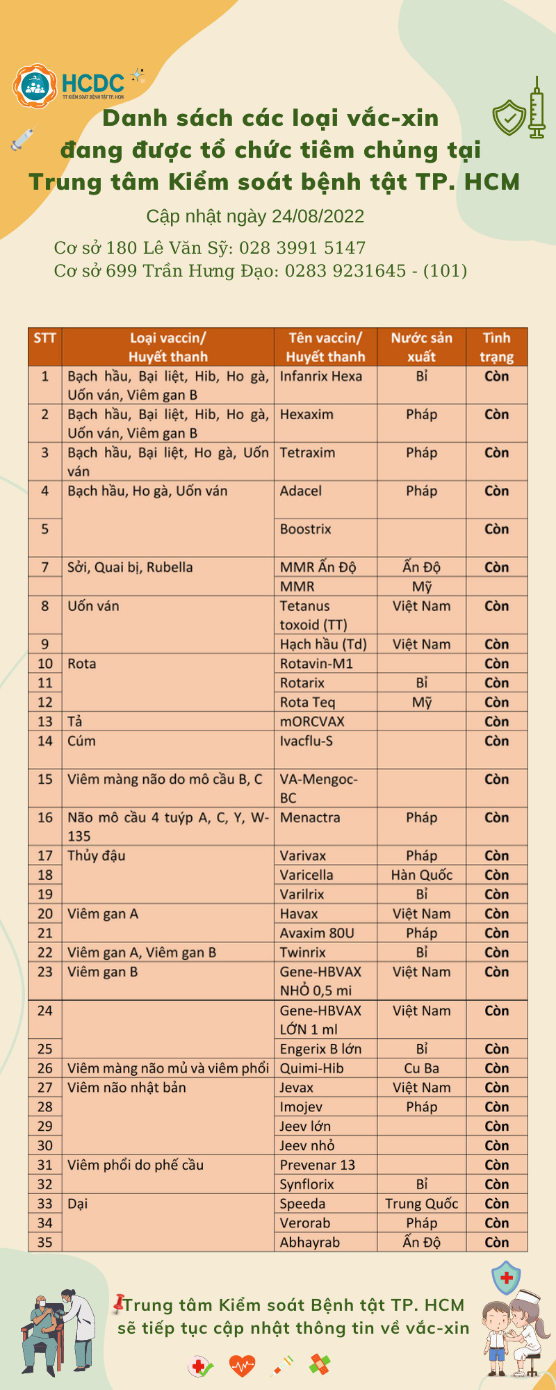 Danh sách các loại vắc-xin đang được tổ chức tiêm chủng tại Trung tâm Kiểm soát bệnh tật TP. Hồ Chí Minh (cập nhật ngày 24/8/2022)