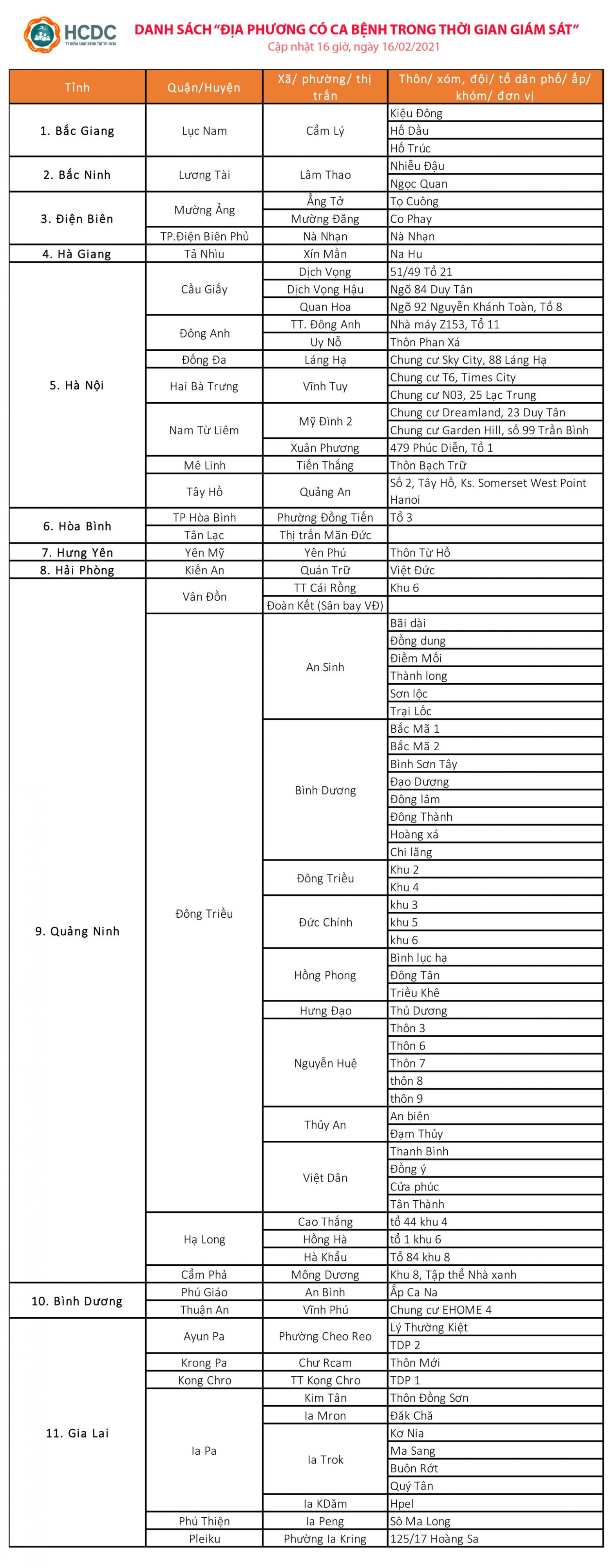 Danh sách "Địa phương có ca bệnh trong thời gian giám sát" cập nhật 16 giờ ngày 16/2/2021