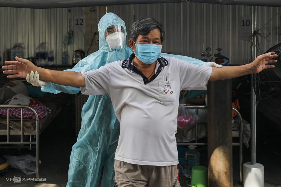 Những F0 ở Bệnh viện Phục hồi chức năng và Điều trị bệnh nghề nghiệp (quận 8), mỗi ngày được bác sĩ hướng dẫn các bài tập cải thiện hô hấp, phục hồi phổi.