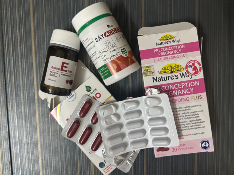 Vừa biết mang thai, Lam, 31 tuổi đặt "combo" thuốc bổ gồm nhiều loại vitamin như E, D, C, canxi, sắt, sau vài tuần uống xuất hiện táo bón nặng, mệt mỏi.