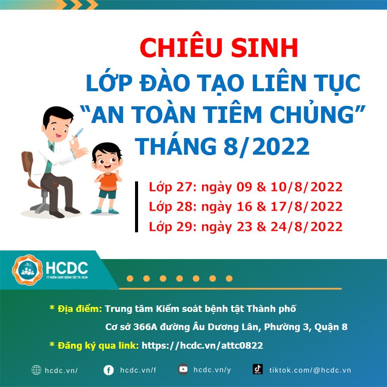 Trung tâm Kiểm soát bệnh tật Thành phố Hồ Chí Minh (HCDC) thông báo chiêu sinh lớp đào tạo liên tục “An toàn tiêm chủng” tháng 8/2022 dành cho nhân viên y tế tham gia hoạt động tiêm chủng hoặc nhân viên y tế có nhu cầu đào tạo liên tục về “An toàn tiêm chủng”.