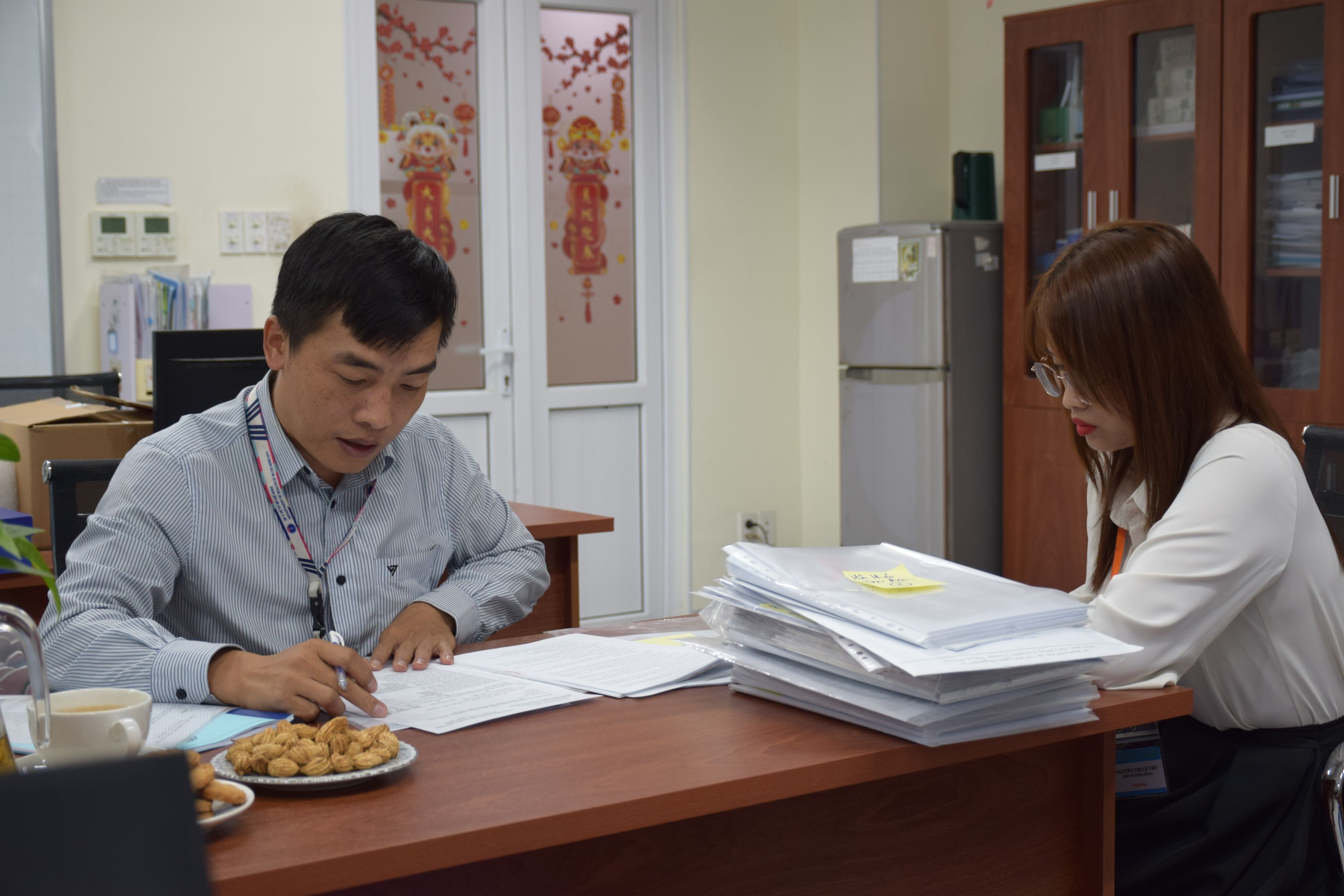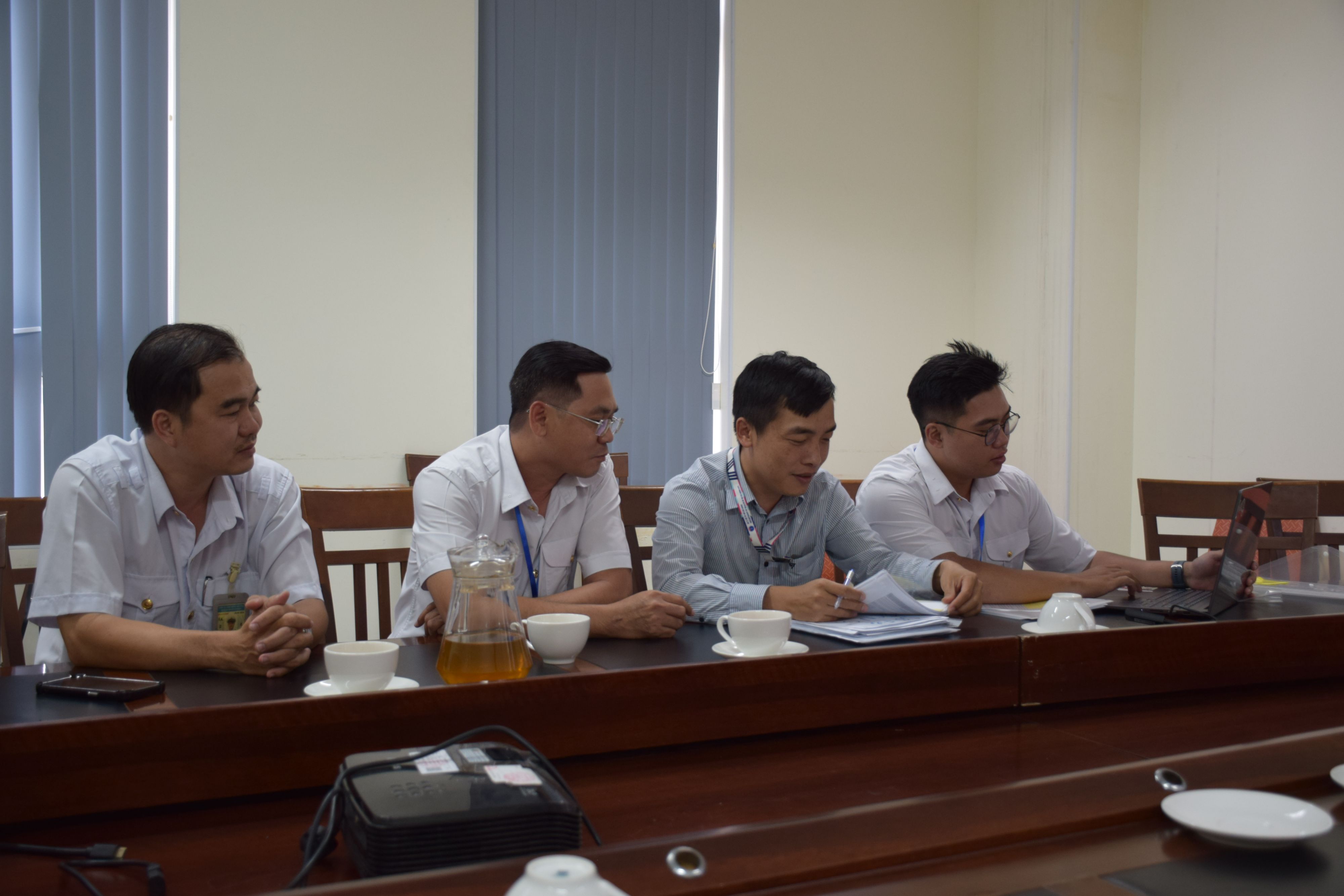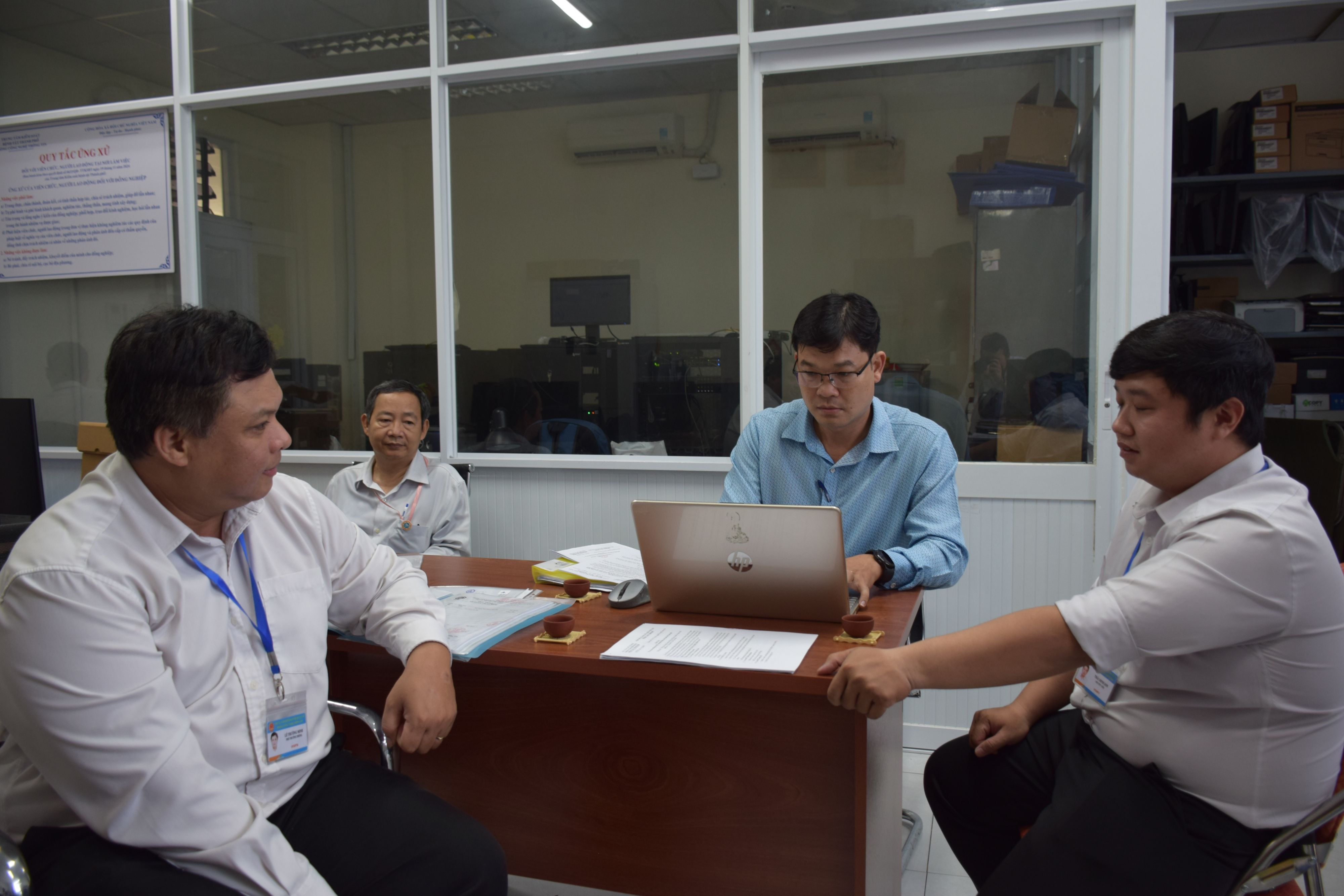 Ảnh: Đoàn kiểm tra làm việc với các bộ phận theo từng tiêu chí chấm điểm