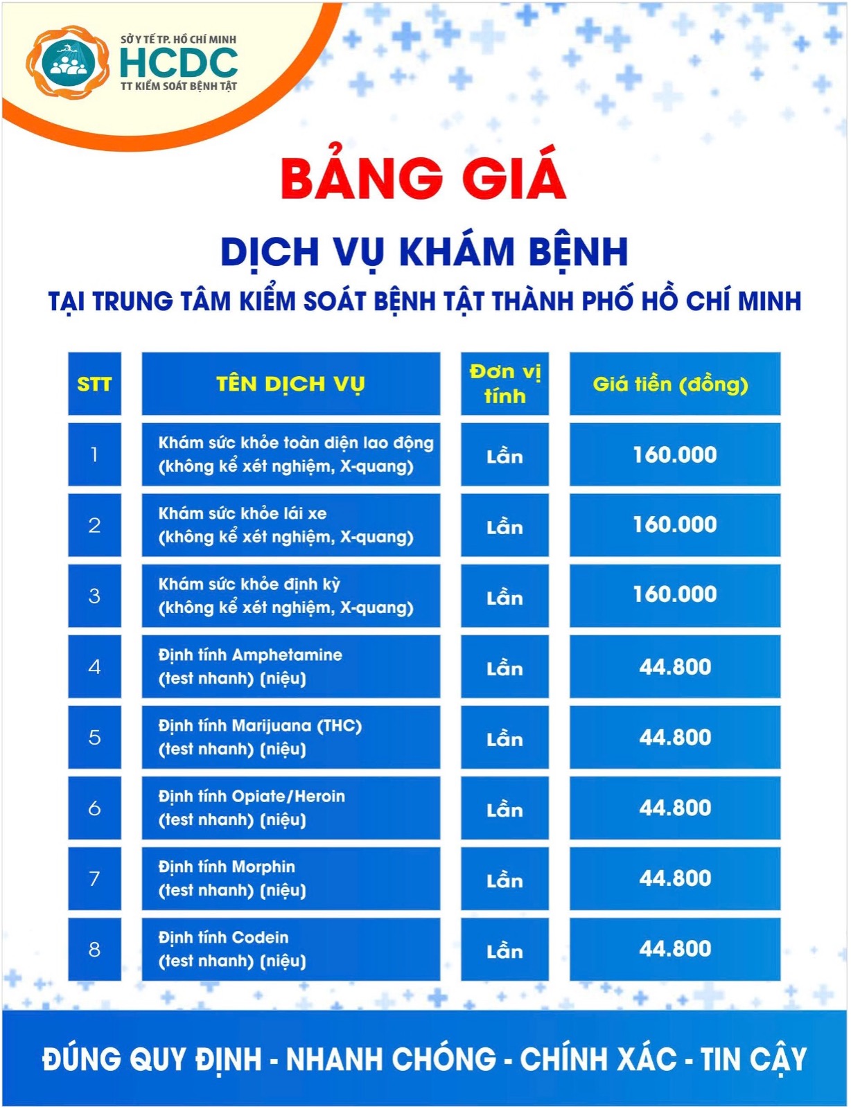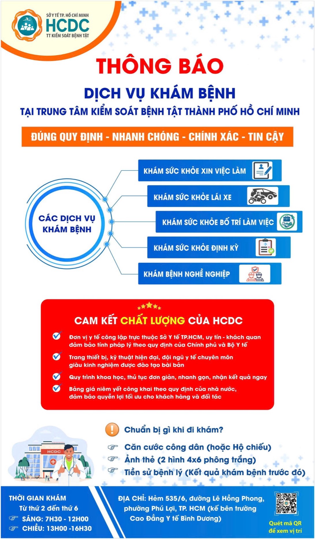 Nhằm đáp ứng nhu cầu khám sức khỏe phục vụ học tập, lao động và các thủ tục hành chính, Trung tâm Kiểm soát bệnh tật Thành phố Hồ Chí Minh (HCDC) tại cơ sở 9 hiện đang cung cấp đa dạng các gói khám sức khỏe với quy trình chuyên môn đúng quy định.