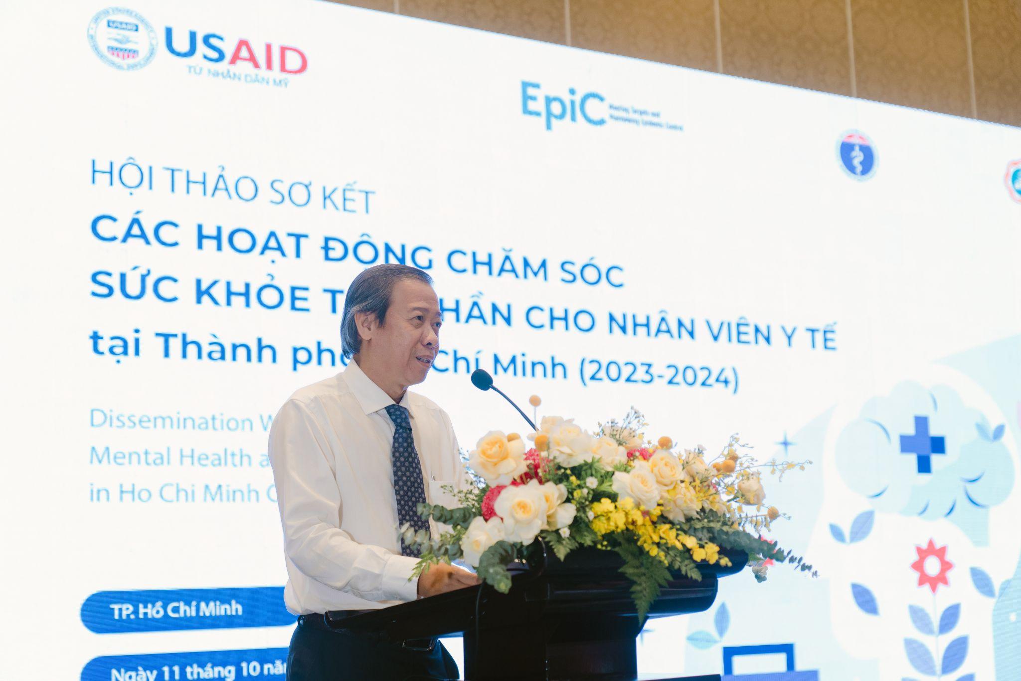 Phát biểu khai mạc tại Hội thảo, TS.BS Nguyễn Văn Vĩnh Châu, phó giám đốc Sở Y tế đã nhấn mạnh tầm quan trọng của sức khỏe tâm thần đối với nhân viên y tế. Từ đầu năm 2023, Sở Y tế đã ban hành Kế hoạch số 385/KH-SYT về việc tổ chức hoạt động chăm sóc sức khỏe tâm thần cho NVYT. Và đến ngày 16/8/2023, Sở y tế phối hợp với Tổ chức FHI thông qua dự án EpiC tại Việt Nam ký biên bản ghi nhớ để cùng phối hợp triển khai các hoạt động chăm sóc SKTT cho NVYT.