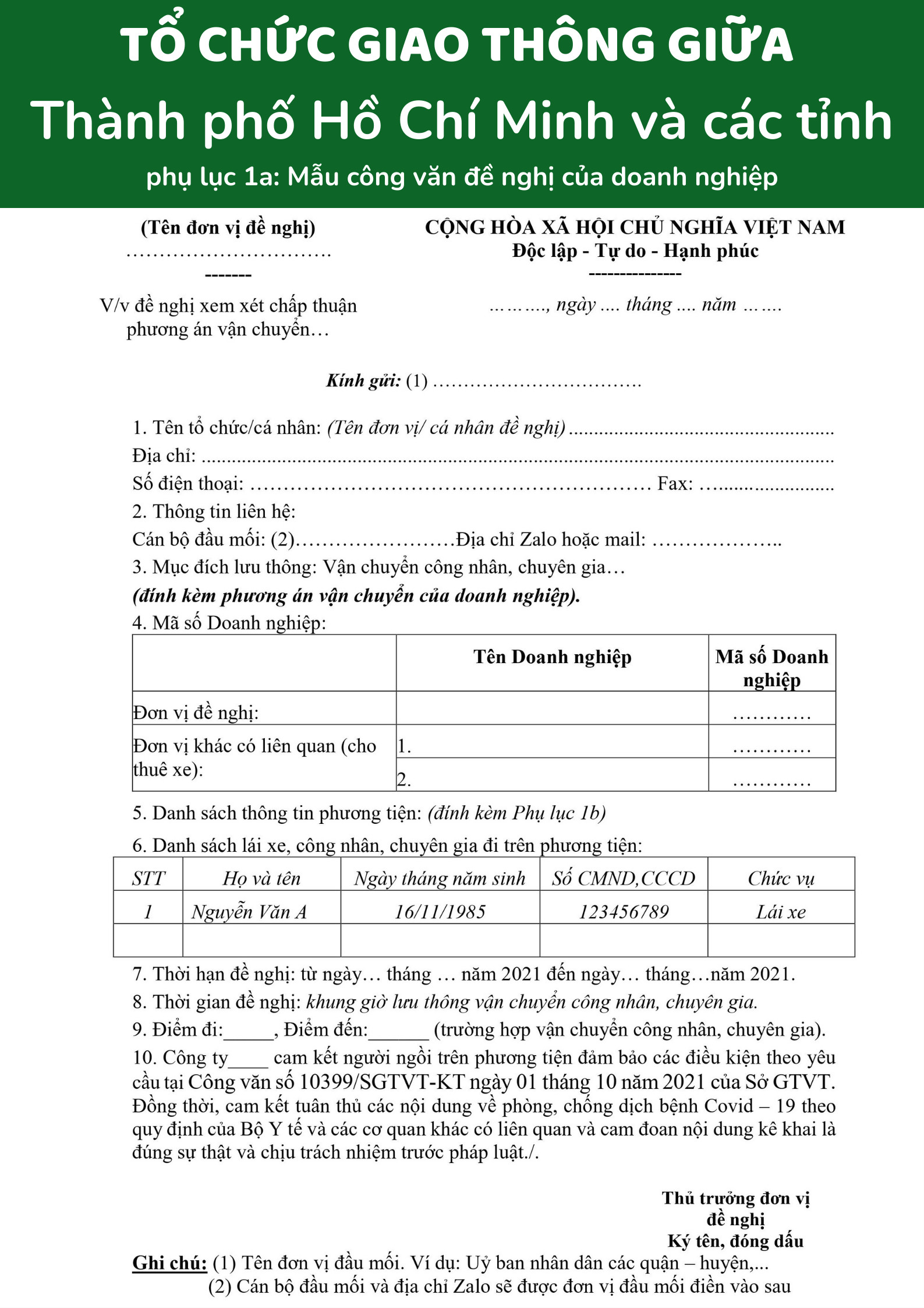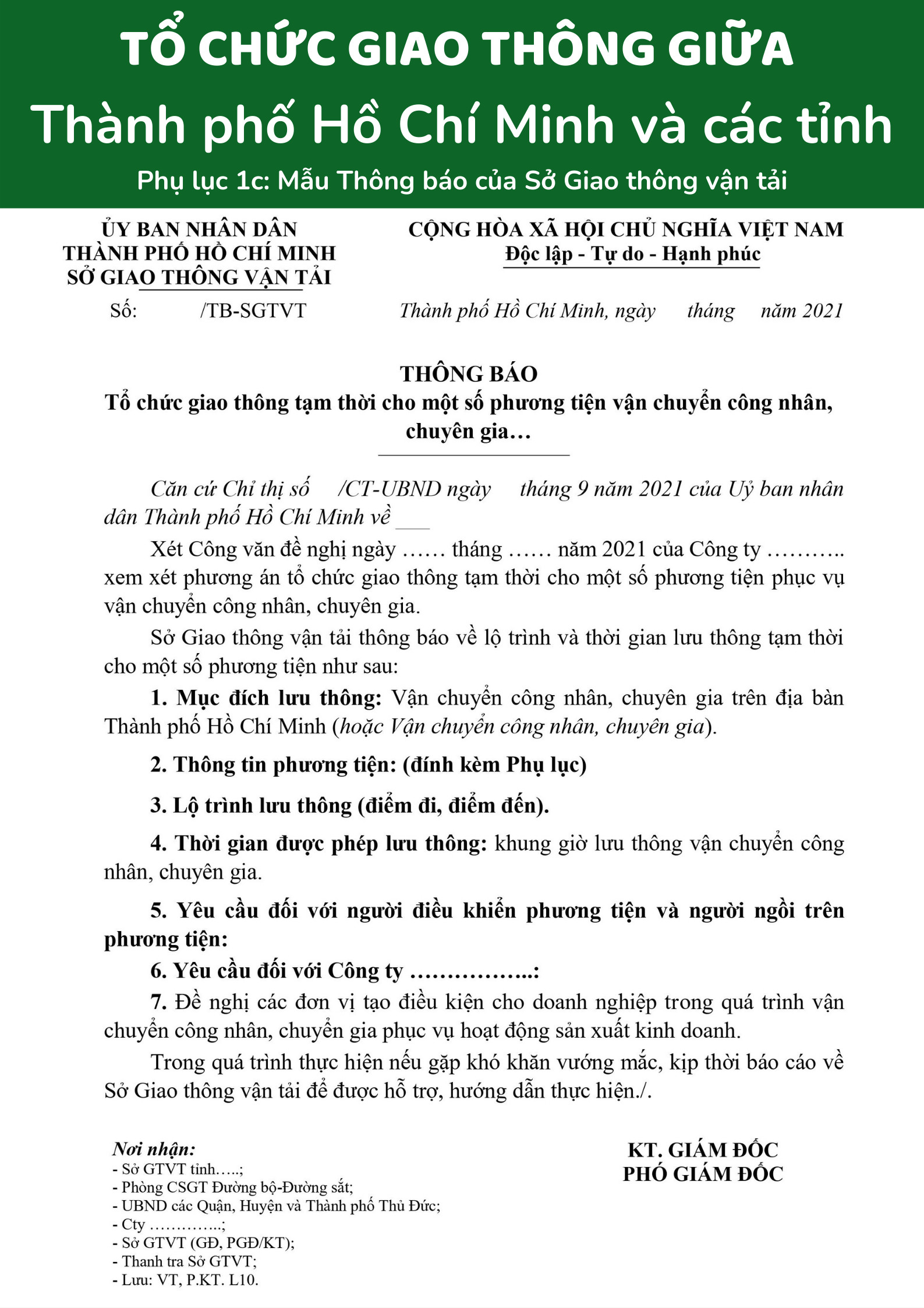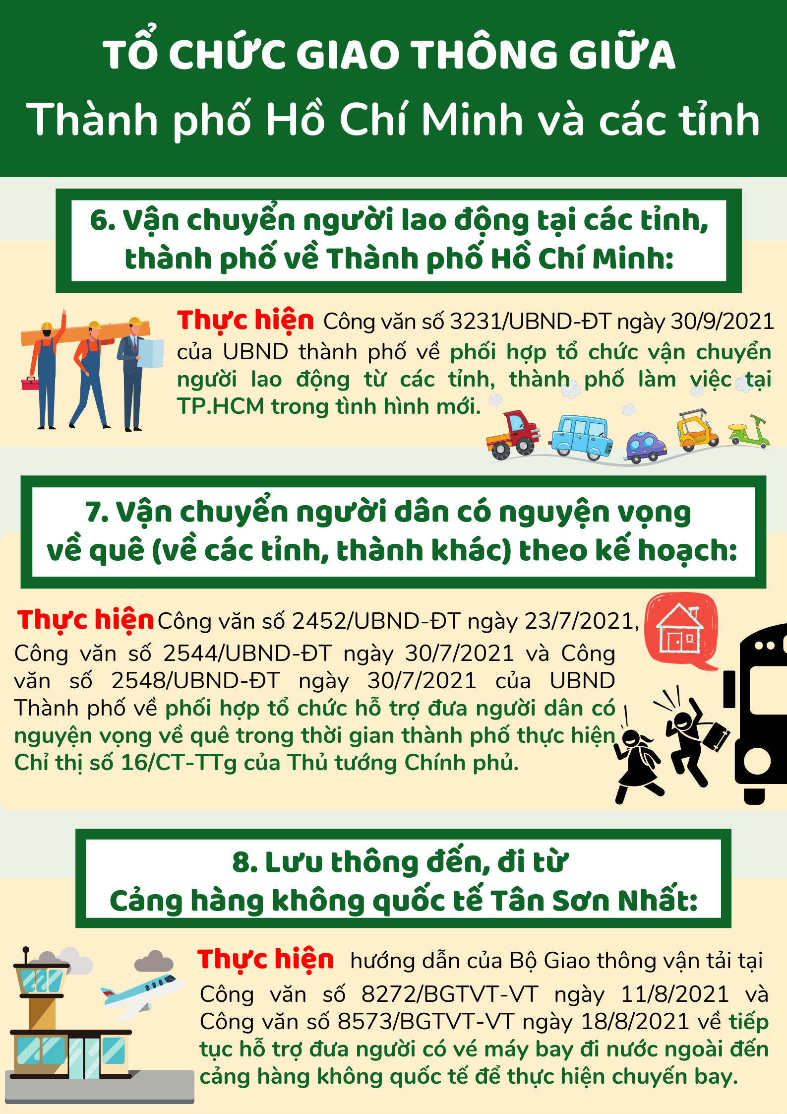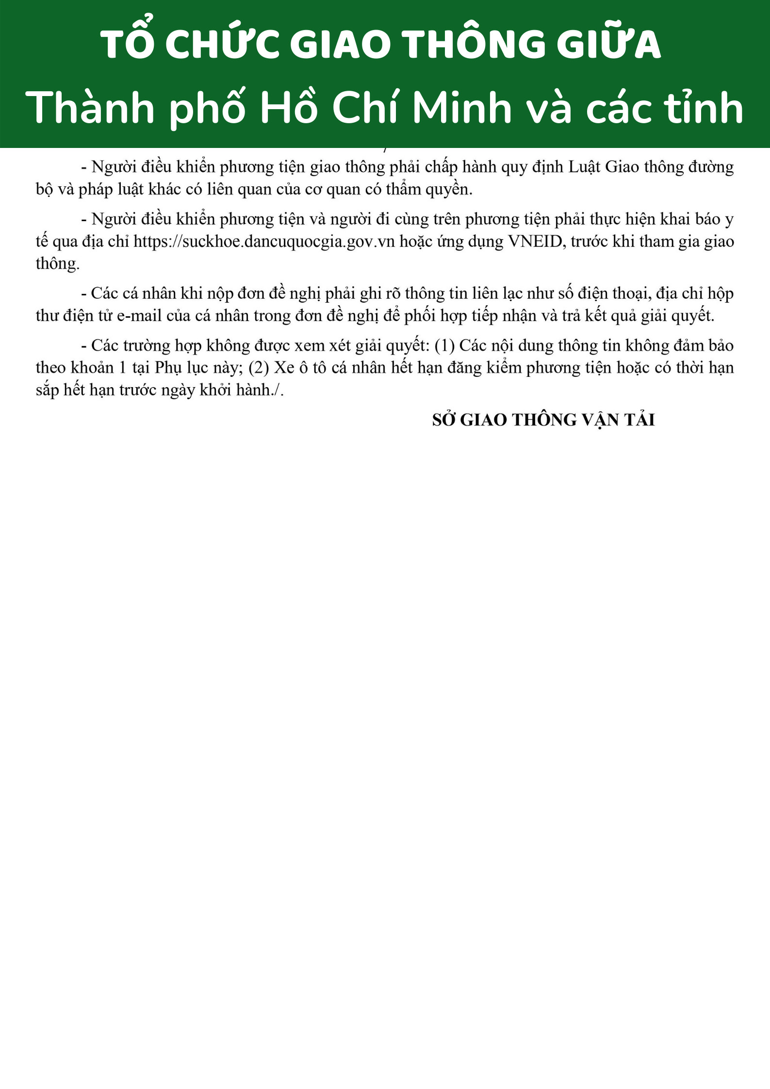 Sở GTVT TP.HCM đã có văn bản hướng dẫn người dân từ TP.HCM đi các tỉnh/thành phố và ngược lại trong một số trường hợp cấp thiết gồm đưa đón người bệnh hiểm nghèo, con nhỏ, phụ nữ mang thai; thực hiện cuộc hẹn phỏng vấn trước khi đi nước ngoài; và một số trường hợp cấp bách khác; người dân TP.HCM từ các tỉnh, thành phố khác trở về TP.HCM.