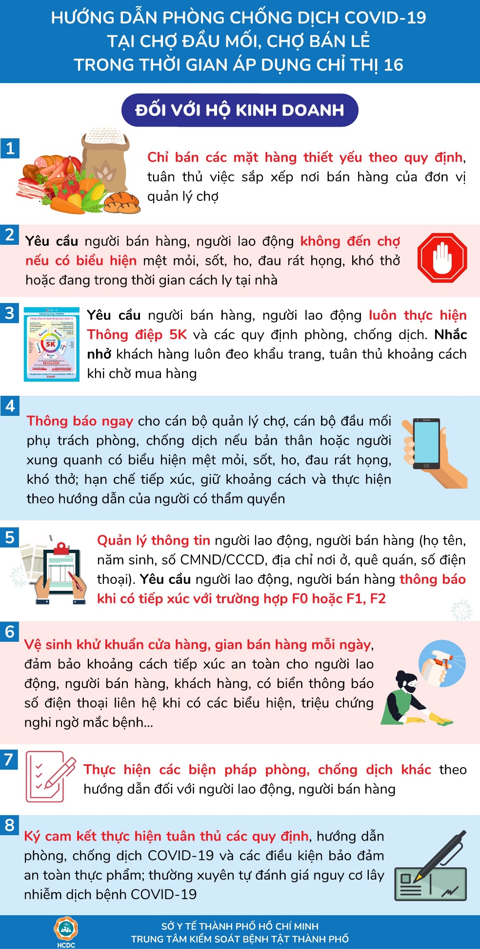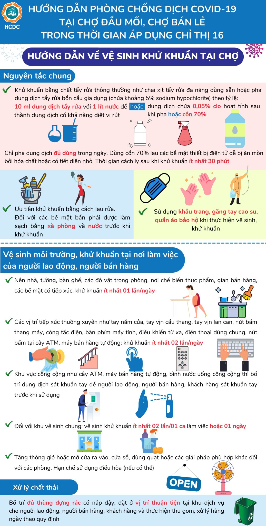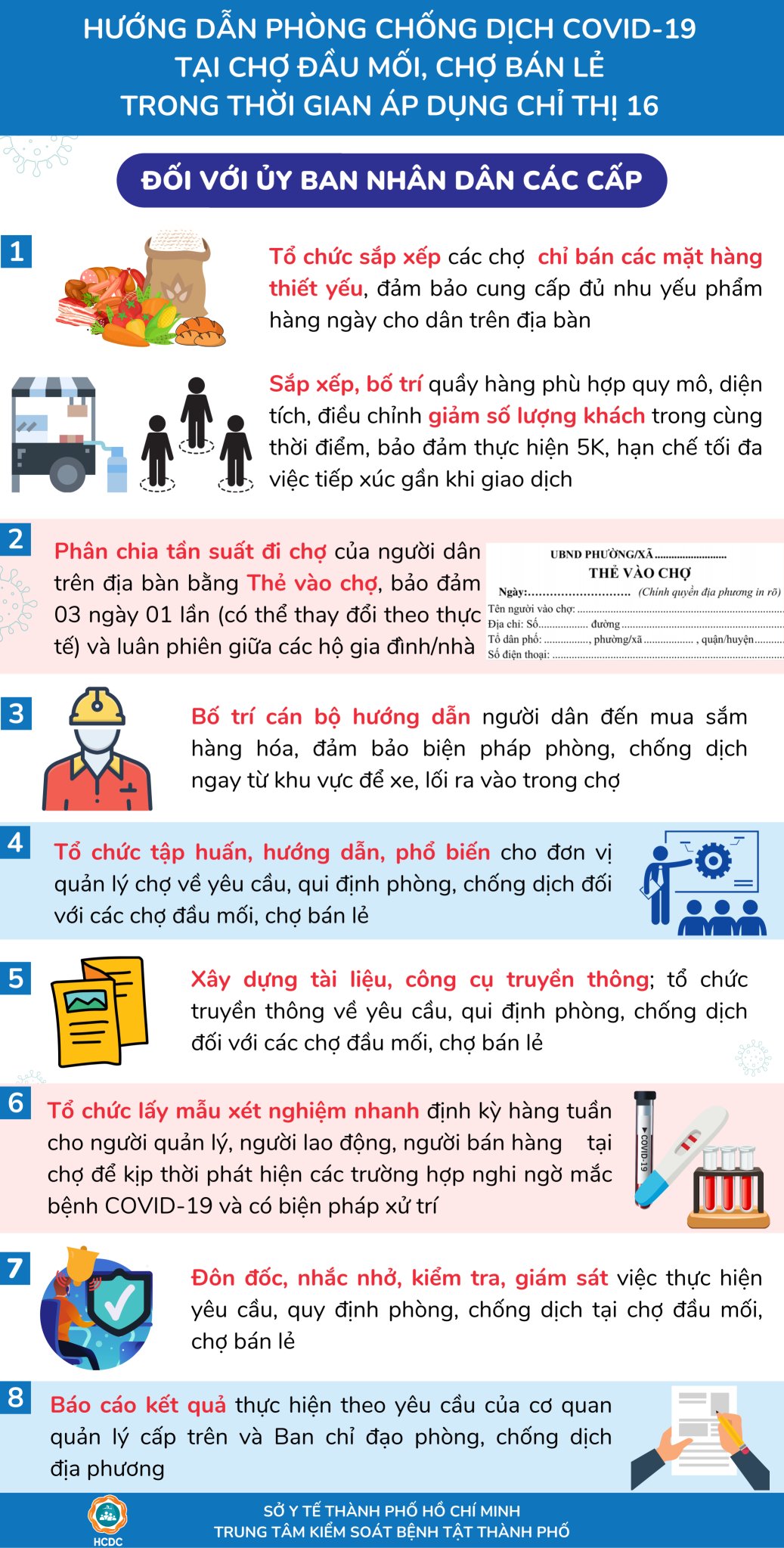 Trước tình hình dịch COVID-19 diễn biến phức tạp, một số tỉnh, thành phố đã thực hiện giãn cách xã hội theo Chỉ thị 16 của Thủ tướng Chính phủ. Để đảm bảo an toàn phòng chống dịch COVID-19, Bộ Y tế đã có hướng dẫn các địa phương thực hiện biện pháp phòng chống dịch COVID-19 tại chợ đầu mối, chợ bán lẻ.