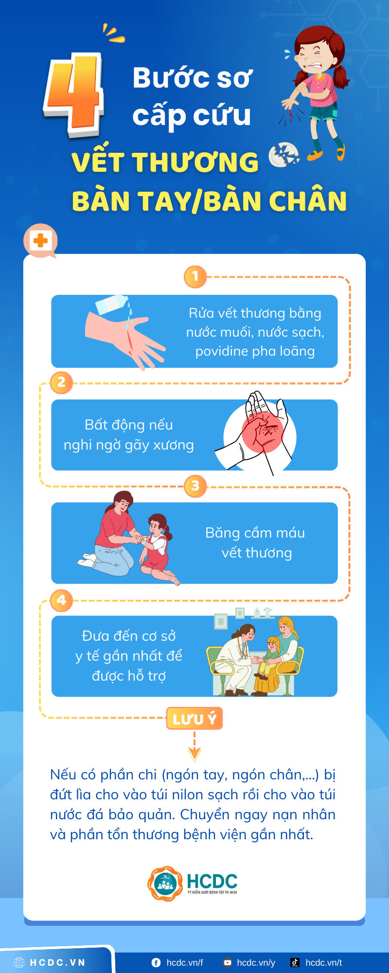 [infographic] 4 bước sơ cấp cứu vết thương bàn tay/bàn chân