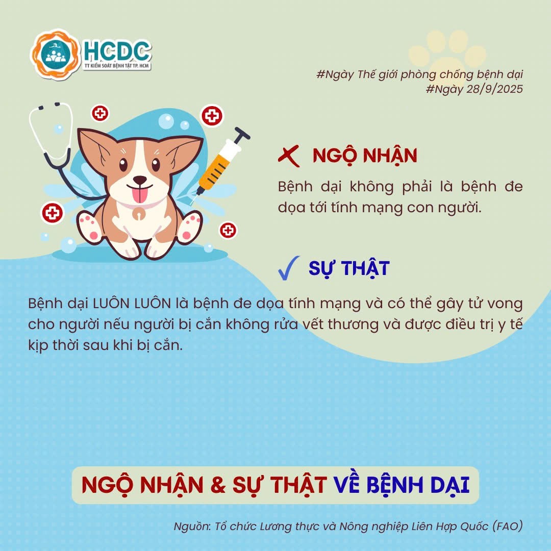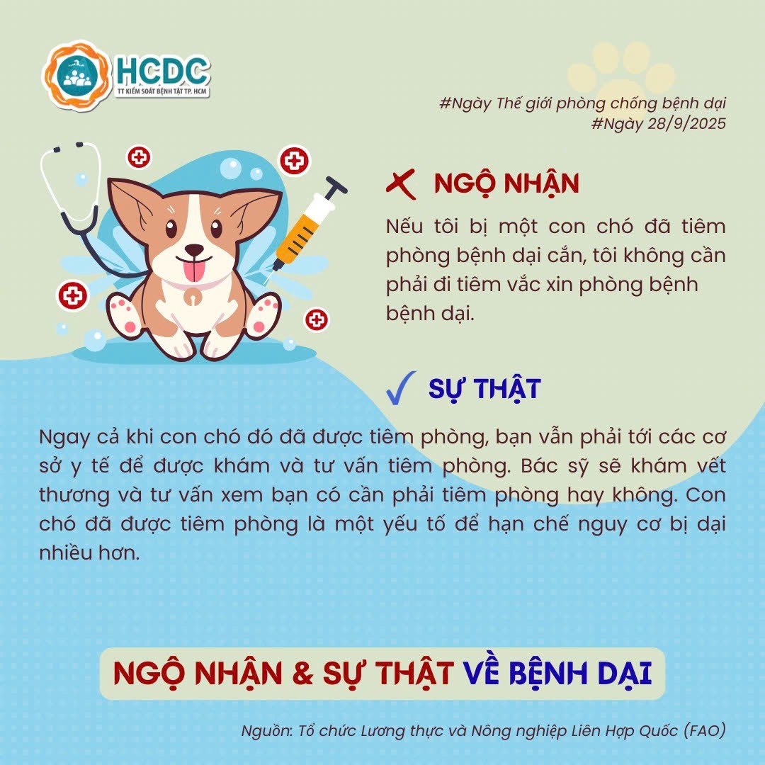 Hưởng ứng Ngày Thế giới phòng chống bệnh Dại 28/9/2025! Trung tâm Kiểm soát bệnh tật Thành phố Hồ Chí Minh (HCDC) đã tổng hợp các ngộ nhận và sự thật về bệnh dại mà mọi người cần biết. Hãy xem ngay bộ infographic này để nắm rõ cách xử trí vết thương, tiêm vắc xin và phòng ngừa hiệu quả các bạn nhé!