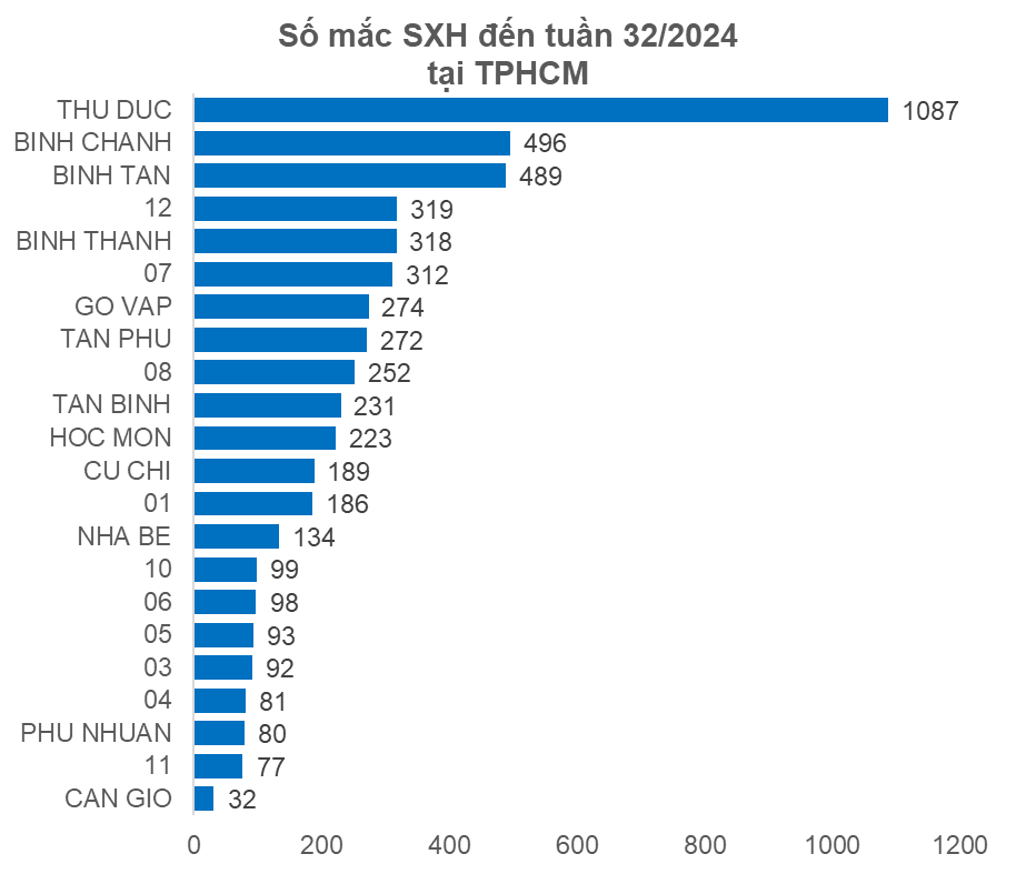 Biểu đồ: Số ca mắc sốt xuất huyết trên địa bàn Thành phố Hồ Chí Minh tính đến ngày 11/8/2024 (tuần 32)