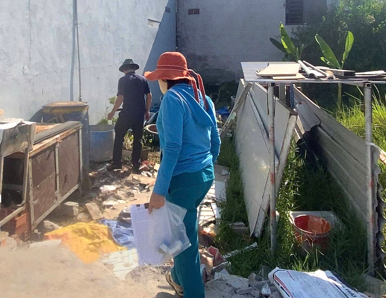 Tại khu vực hẻm 1616 đường 30/4, dù chưa ghi nhận lăng quăng nhưng đoàn kiểm tra vẫn phát hiện nhiều vật dụng đọng nước tại các khu vườn. Nhân viên y tế đã trực tiếp hướng dẫn người dân thực hiện các biện pháp vệ sinh như lật úp và loại bỏ các vật dụng phế thải.