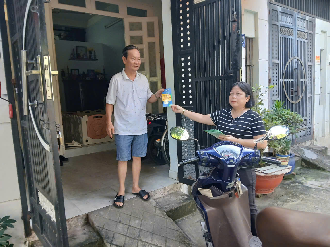 Cộng tác viên sức khỏe cộng đồng phát tờ rơi truyền thông phòng bệnh sốt xuất huyết và Chikungunya đến từng hộ dân.