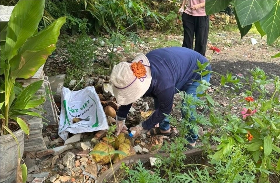 Cộng tác viên sức khoẻ cộng đồng dọn dẹp, loại bỏ vật chứa nước đọng tại chùa Phổ Chiếu