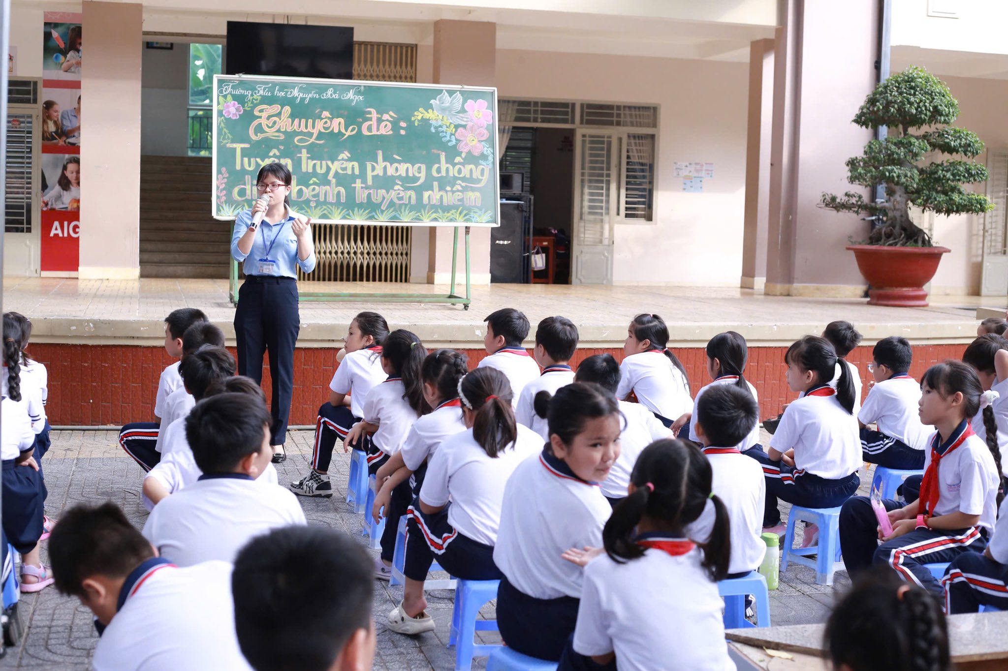 Tại buổi truyền thông, bác sĩ Trần Thị Phương Nga Nga – Phụ trách Khoa Phòng bệnh – An toàn thực phẩm, Trạm Y tế phường Bà Rịa đã khéo léo lồng ghép kiến thức về bệnh tay chân miệng, thủy đậu và sốt xuất huyết qua những câu chuyện gần gũi. Bằng hình thức giao lưu hỏi đáp sinh động, các em học sinh không chỉ hiểu về mức độ nguy hiểm của dịch bệnh mà còn học được cách nhận biết nhanh những dấu hiệu bất thường trên cơ thể.