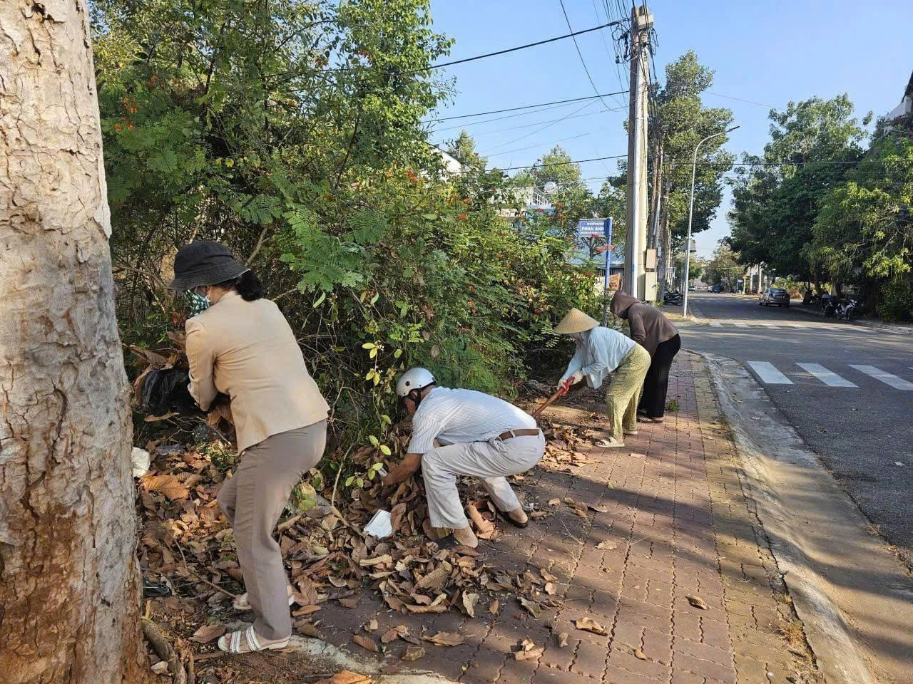 Ảnh: Người dân phối hợp cùng các lực lượng chức năng ra quân vệ sinh môi trường và diệt lăng quăng tại các khu dân cư.