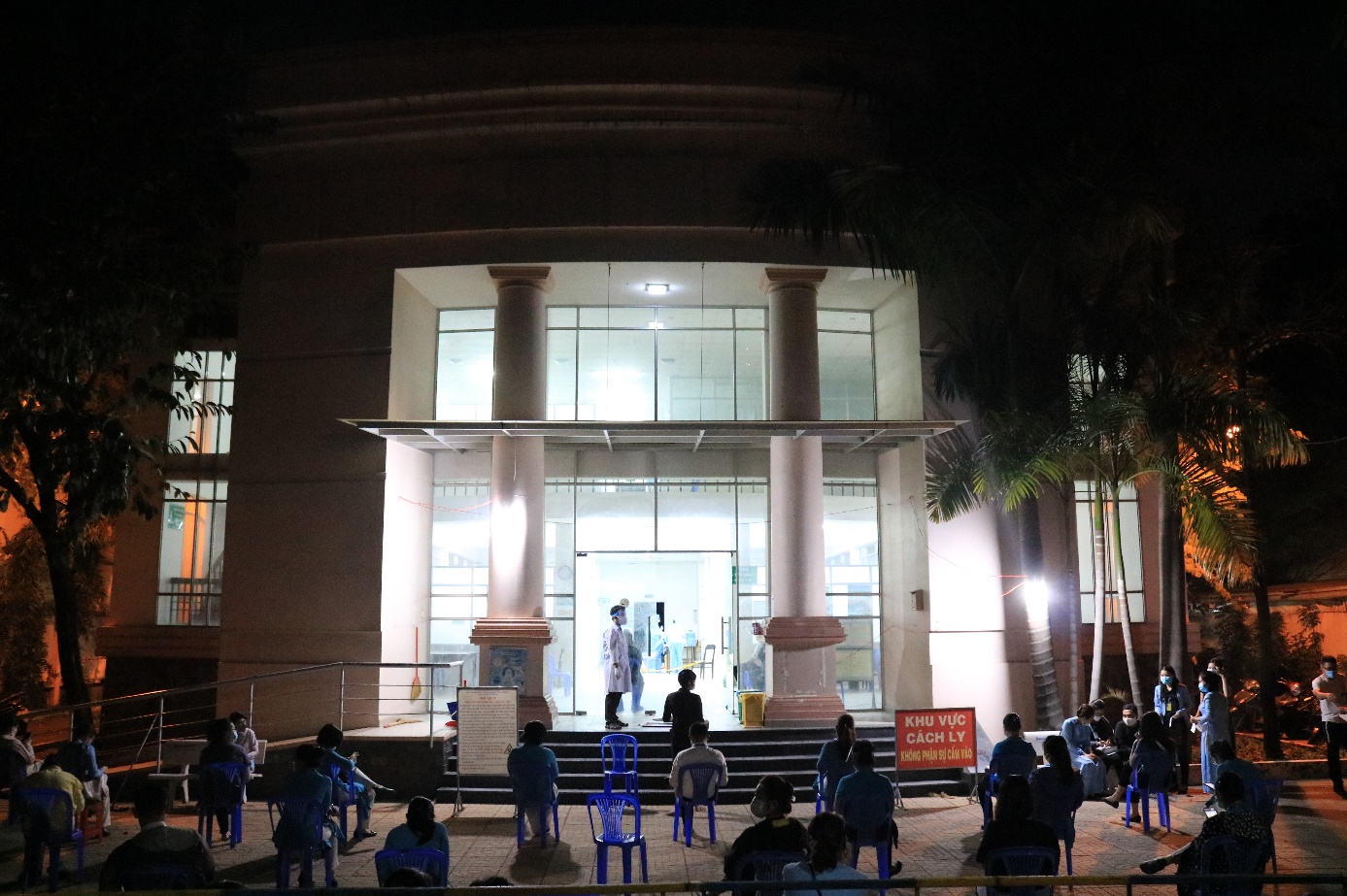 Người lấy mẫu xét nghiệm nghiêm túc chấp hành thứ tự lấy mẫu và ngồi chờ trật tự tại chỗ ngồi được sắp xếp để đảm bảo khoảng cách an toàn tại khu vực sân chờ.