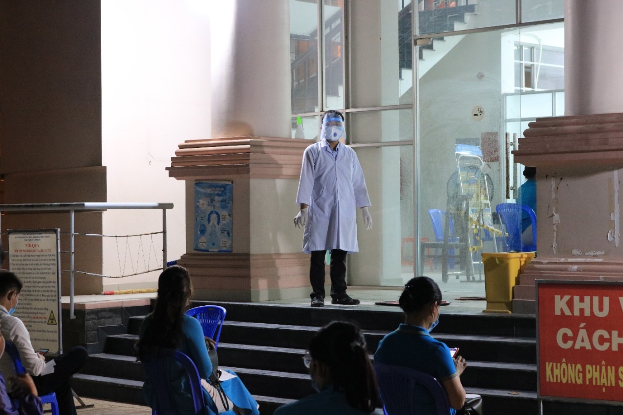 Khi tiến vào khu vực lấy mẫu, người lấy mẫu được hướng dẫn sát khuẩn giày, dép bằng thảm tẩm dung dịch Chloramine B 0,1% và rửa tay một lần nữa bằng dung dịch sát khuẩn nhanh. Sau đó sẽ được sắp xếp chỗ ngồi đảm bảo khoảng cách an toàn khi chờ đến lượt.
