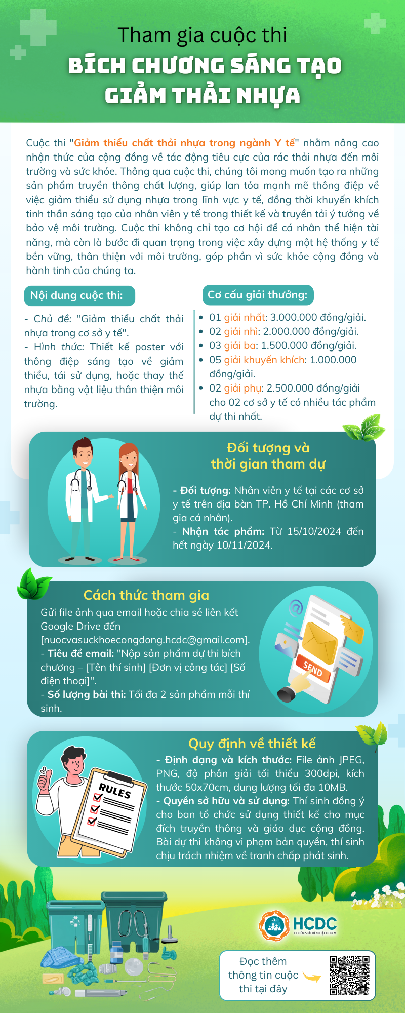Để tạo ra một sự thay đổi tích cực, Trung tâm Kiểm soát Bệnh tật TP. Hồ Chí Minh (HCDC) tổ chức Cuộc thi Thiết kế Bích chương với chủ đề "Giảm thiểu chất thải nhựa tại cơ sở y tế năm 2024." Đây là cơ hội để nhân viên y tế trên địa bàn Thành phố Hồ Chí Minh thể hiện sự sáng tạo, đồng thời lan tỏa những thông điệp ý nghĩa về bảo vệ môi trường.
