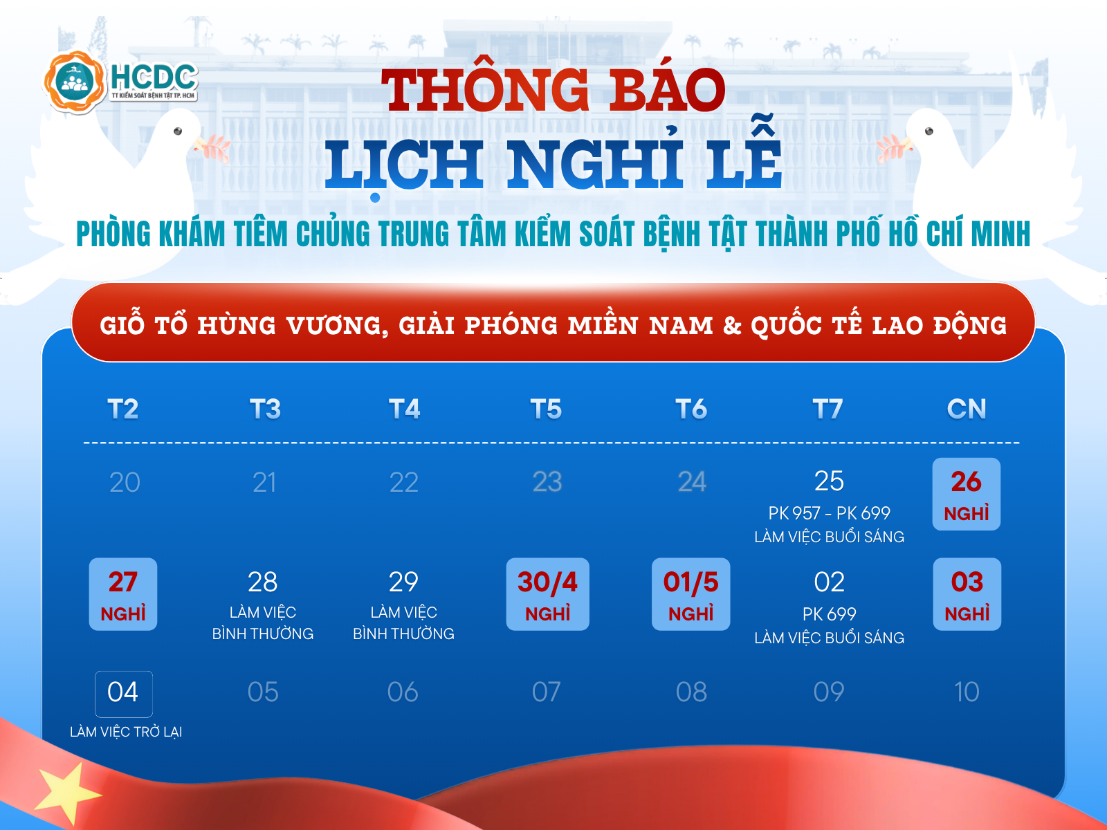 Chỉ còn vài ngày nữa là chúng ta sẽ bước vào kỳ nghỉ lễ dài ngày của năm. Để Quý vị có thể chủ động sắp xếp thời gian đưa người thân, con em đi tiêm ngừa đúng lịch mà không bị gián đoạn, Trung tâm Kiểm soát bệnh tật Thành phố Hồ Chí Minh (HCDC) xin trân trọng thông báo lịch hoạt động chi tiết như sau: