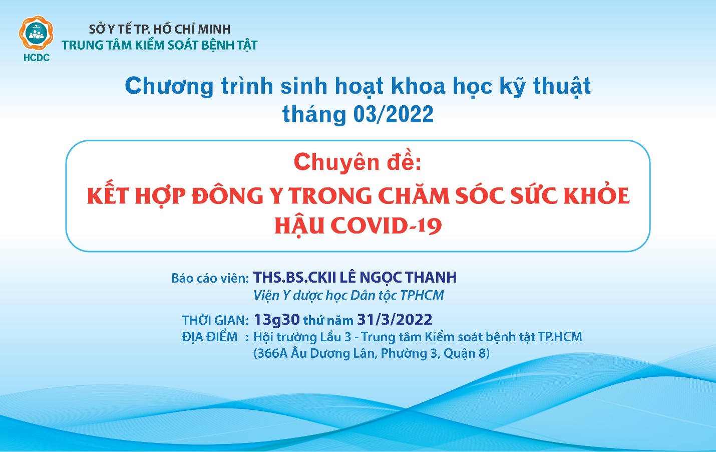 ▪ Địa điểm: Hội trường lầu 3, Trung tâm Kiểm soát bệnh tật thành phố (Địa chỉ: 366A, Âu Dương Lân, Phường 3, Quận 8)