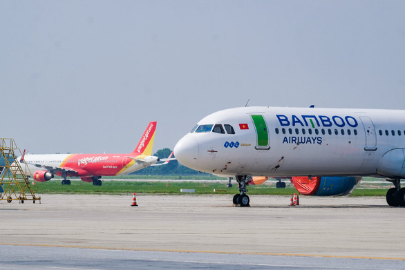 Phần lớn đội máy bay của các hãng hàng không Việt Nam đang bọc kín động cơ để bảo quả vì dừng hàng tháng trời khi các địa phương giãn cách theo chỉ thị 16 - Ảnh: Nam Trần