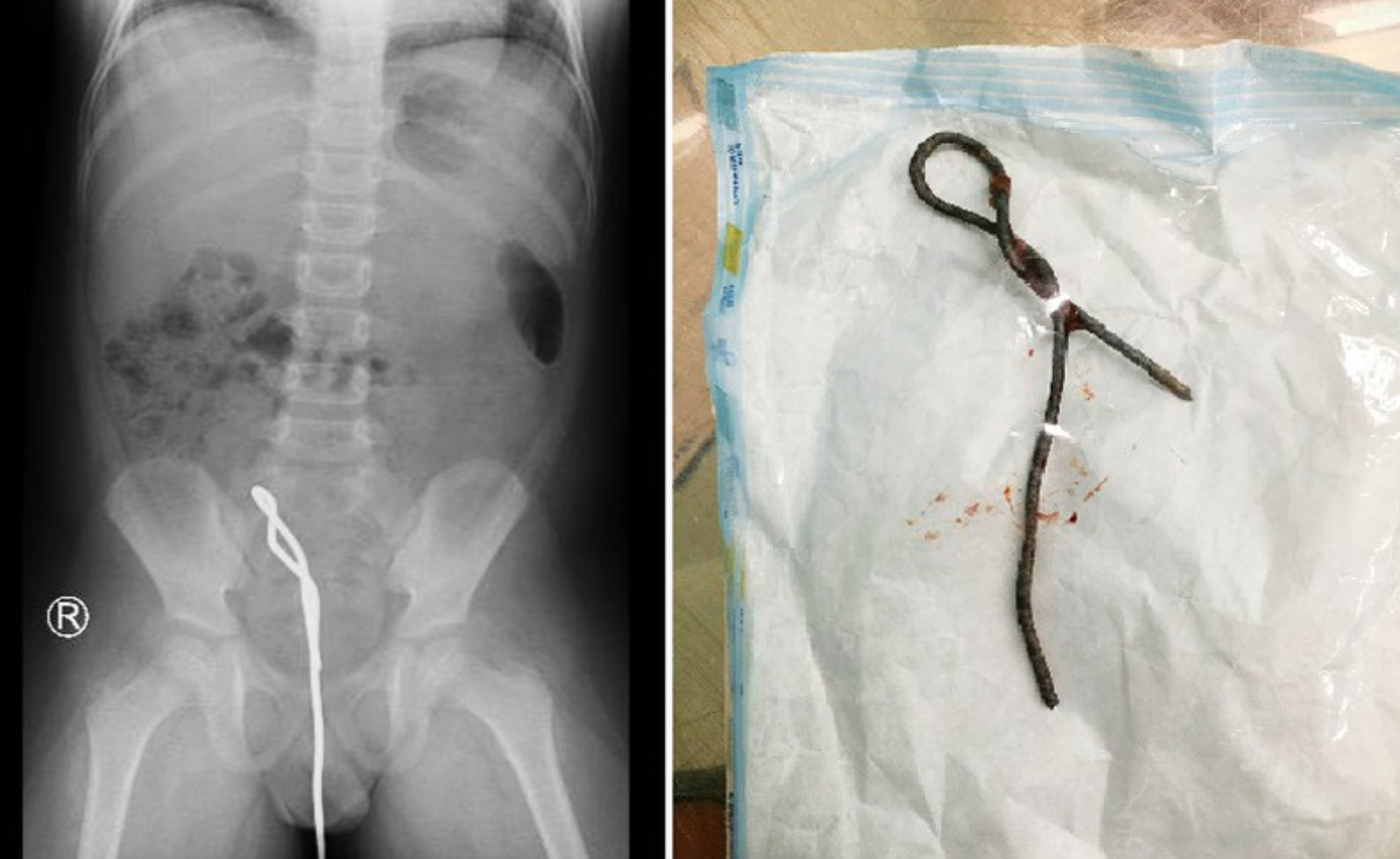 Bé trai 6 tuổi nhét thanh sắt thông cống vào hậu môn rồi rút ra không được. Gia đình cho biết bé học theo phim và còn tập cho em trai làm theo.