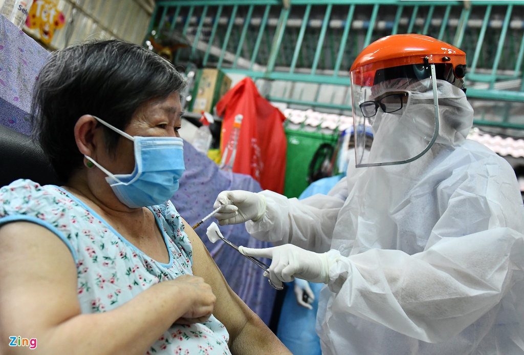 Nhân viên y tế mang vaccine Pfizer đến tận nhà để tiêm cho người cao tuổi. Ảnh: Phạm Ngôn.