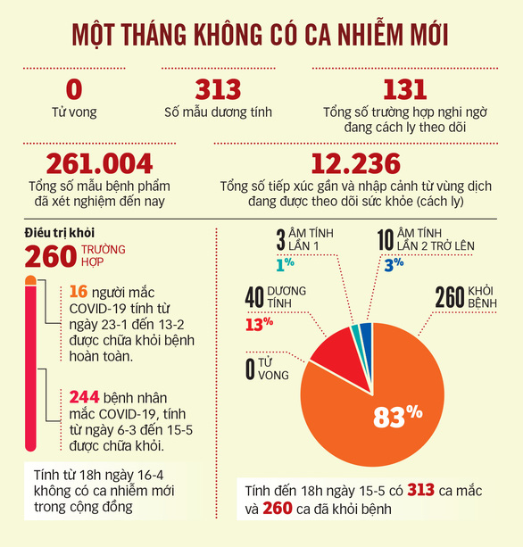 Nếu chiếu theo điều kiện, tính từ bệnh nhân ghi nhận gần nhất ở cộng đồng là bệnh nhân 268 (thực ra được cách ly từ ngày 7-4) là thừa thời gian để công bố hết dịch ở cộng đồng.
