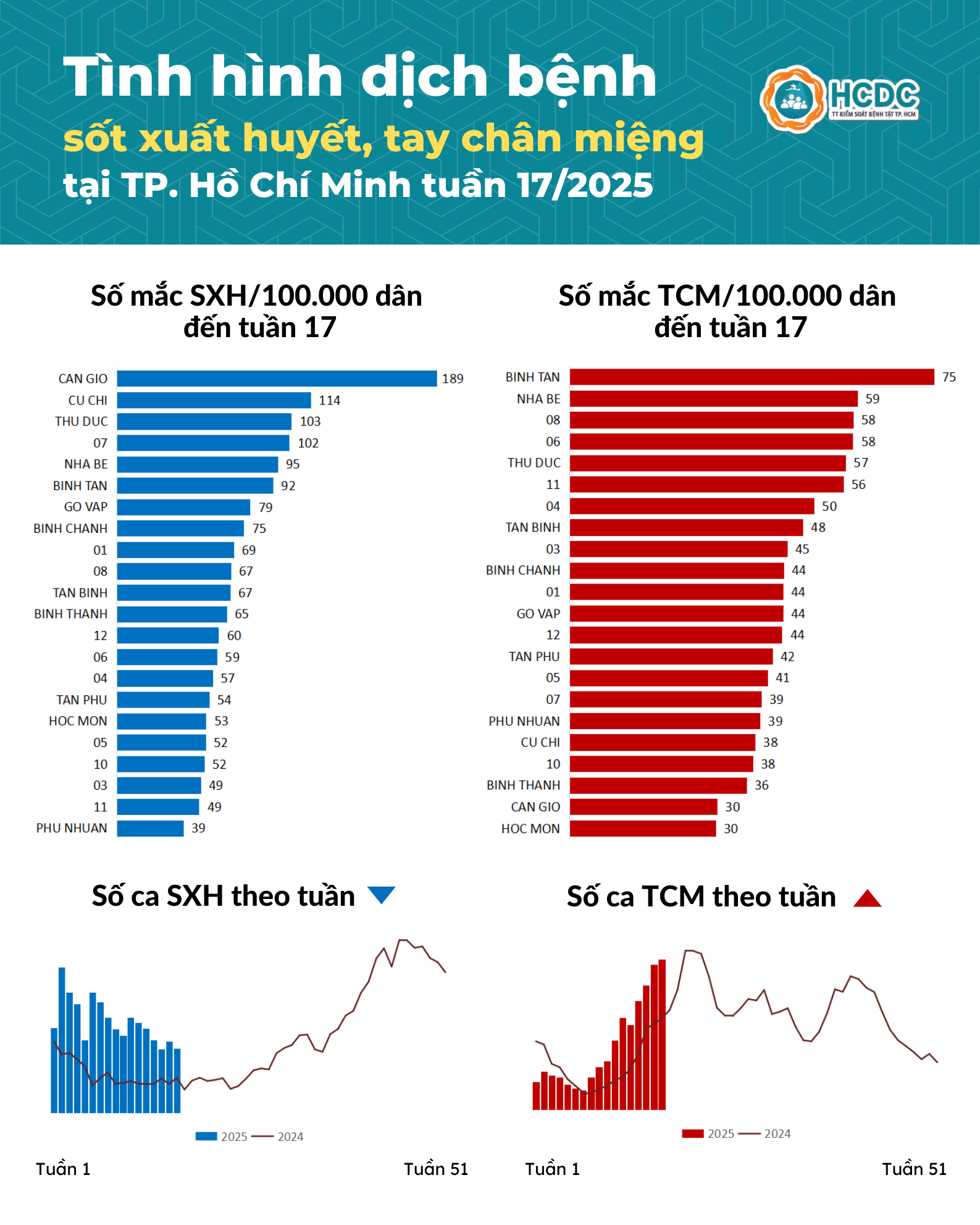 Trong tuần 17, TP. Hồ Chí Minh cũng ghi nhận 590 trường hợp mắc bệnh tay chân miệng, tăng 30% so với trung bình 4 tuần trước. Tổng số ca tay chân miệng tích lũy từ đầu năm 2025 đến tuần 17 là 4.337 ca. Các quận huyện có số ca mắc trên 100.000 dân cao bao gồm quận Bình Tân, huyện Nhà Bè và Quận 8.