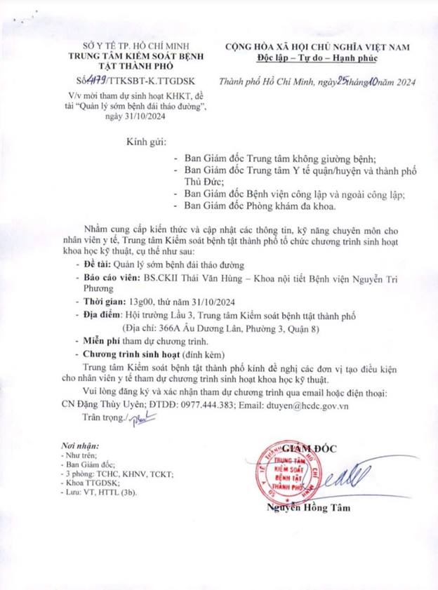 Địa điểm: Hội trường Lầu 3, Trung tâm Kiểm soát bệnh ttật thành phố