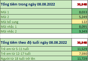 Tính đến hết ngày 08/08/2022, 22.861.242 mũi (bao gồm 8.582.912 mũi 1; 7.650.228 mũi 2; 687.782 mũi bổ sung; 4.670.701 mũi nhắc lần 1; 1.269.619 mũi nhắc lần 2).