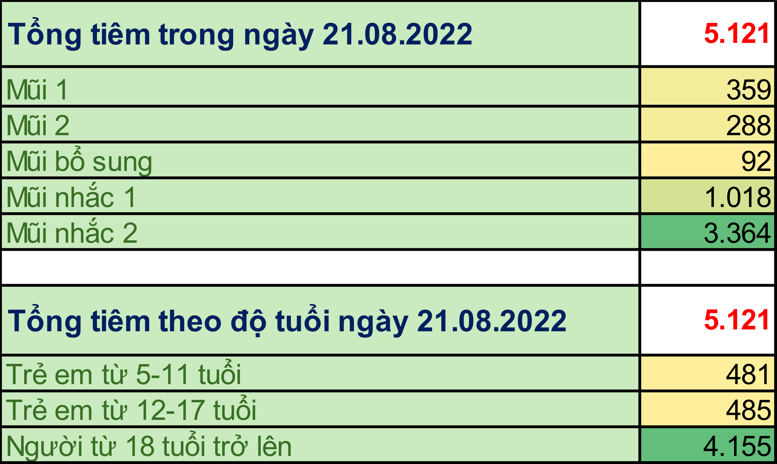 Trong ngày 21/8/2022: toàn thành phố đã tiêm được 5.121 mũi tiêm, bao gồm 359 mũi 1 (7%); 288 mũi 2 (5%); 92 mũi bổ sung (2%); 1.018 mũi nhắc lần 1 (20%); 3.364 mũi nhắc lần 2 (66%) tại 63 điểm tiêm. Trong đó: người từ 18 tuổi trở lên đã tiêm được 4.155 mũi (82%); trẻ từ 12 đến dưới 18 tuổi: đã tiêm được 485 mũi (9%); trẻ từ 05 đến dưới 12 tuổi: đã tiêm được 481 mũi (9%).