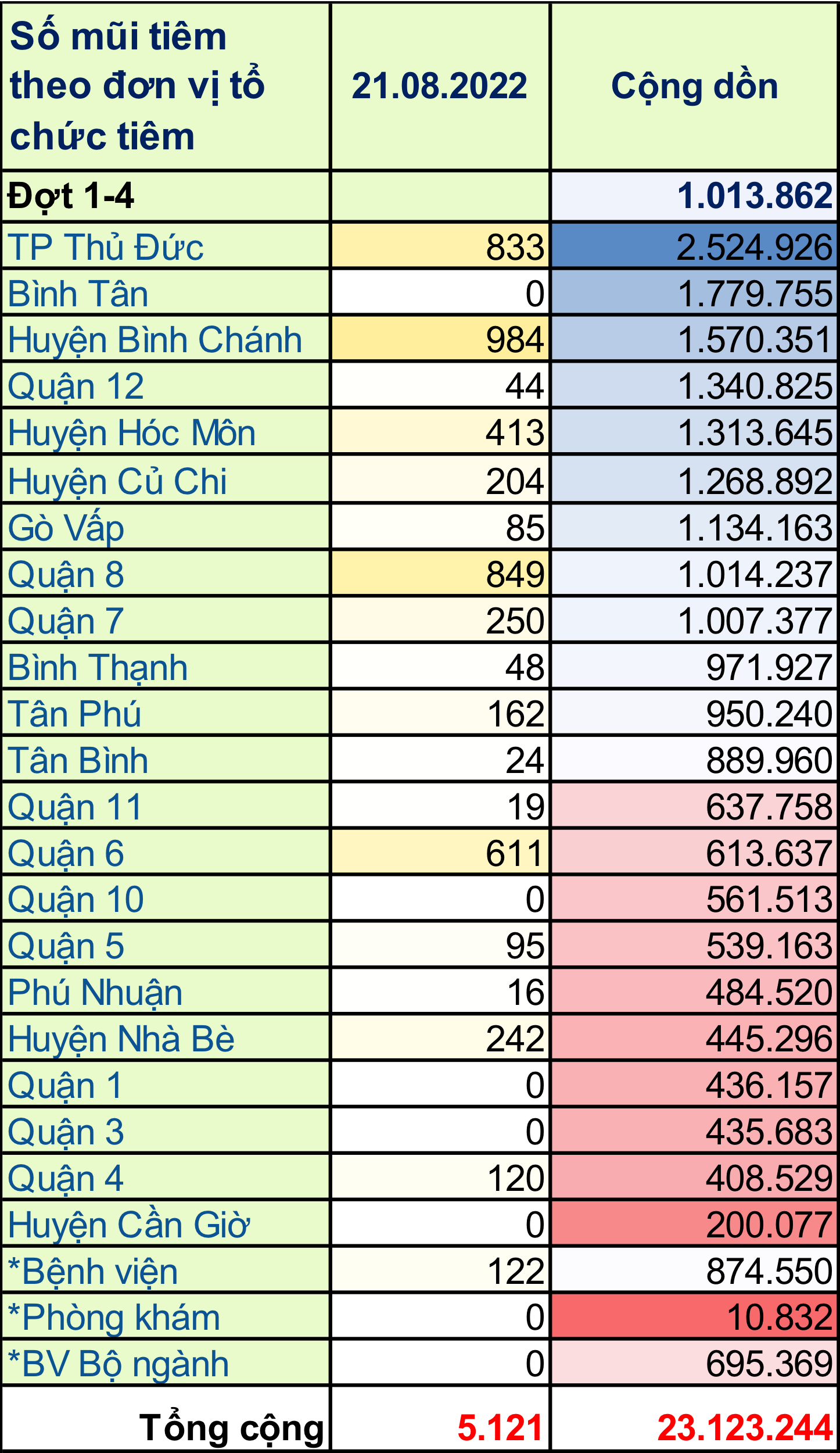 TP. Hồ Chí Minh: Cập nhật số liệu tiêm chủng vắc xin phòng COVID-19 ngày 21/8/2022