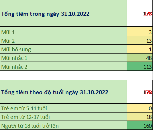 Trong ngày 31/10/2022 toàn thành phố đã tiêm được 178 mũi tiêm, bao gồm 3 mũi 1; 13 mũi 2; 1 mũi bổ sung; 48 mũi nhắc lần 1; 113 mũi nhắc lần 2 tại 39 điểm tiêm. Trong đó: người từ 18 tuổi trở lên đã tiêm được 160 mũi (90%); trẻ từ 12 đến dưới 18 tuổi: đã tiêm được 18 mũi (10%); trẻ từ 05 đến dưới 12 tuổi: đã tiêm được 0 mũi (0%).