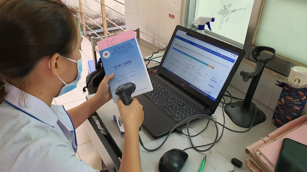 Nhân viên y tế hỗ trợ người dân khai báo y tế điện tử