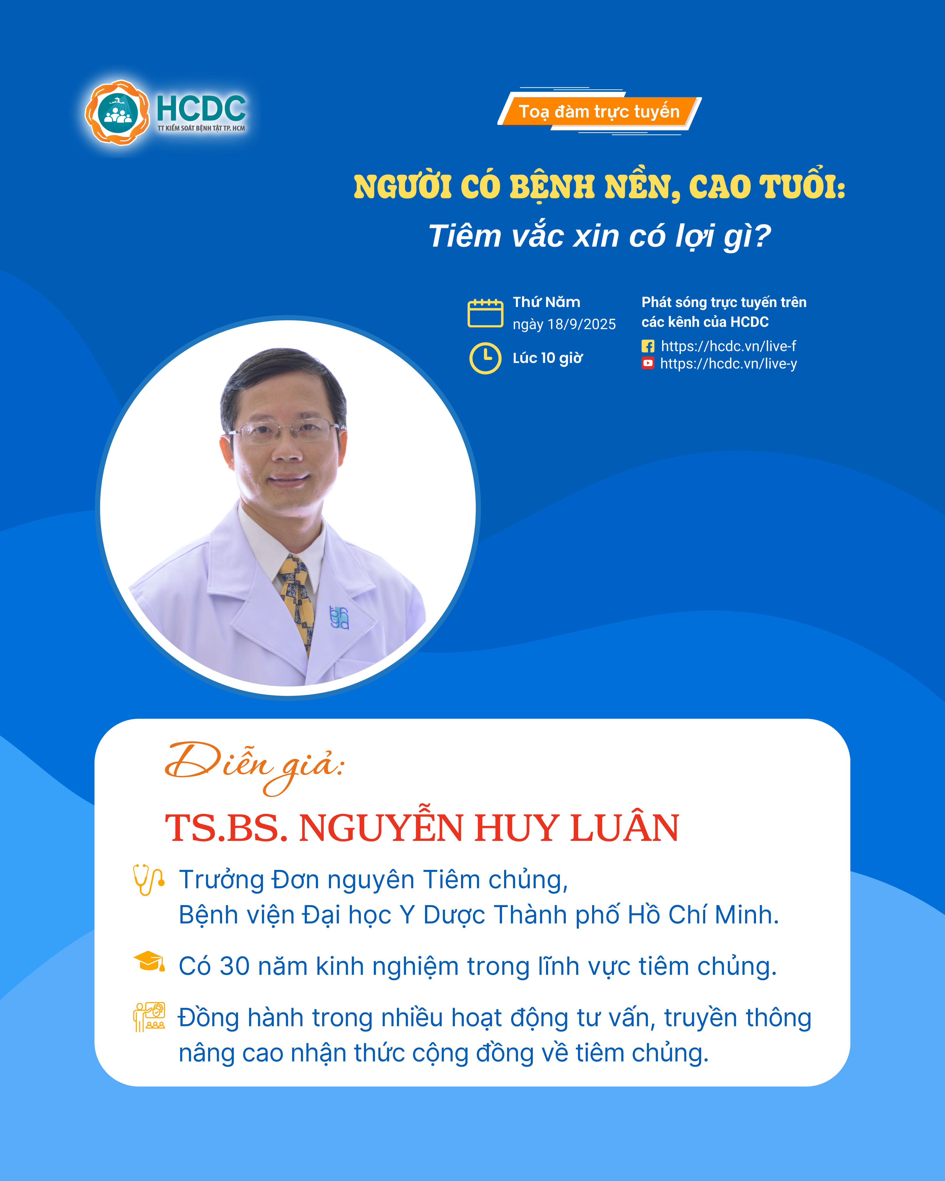 Để giải đáp những lo lắng này, tọa đàm trực tuyến “Người có bệnh nền, cao tuổi: Tiêm vắc xin có lợi gì?” do Trung tâm Kiểm soát bệnh tật Thành phố Hồ Chí Minh (HCDC) tổ chức vinh dự có sự đồng hành của TS. BS. Nguyễn Huy Luân - Trưởng Đơn nguyên Tiêm chủng, Bệnh viện Đại học Y Dược Thành phố Hồ Chí Minh. Với kinh nghiệm dày dặn, bác sĩ sẽ mang đến những phân tích rõ ràng, dễ hiểu về lý do nhóm nguy cơ cần được ưu tiên tiêm chủng, đồng thời chia sẻ cách đảm bảo an toàn trong từng bước trước, trong và sau tiêm. Những lời khuyên thiết thực từ bác sĩ chắc chắn sẽ giúp các gia đình thêm vững tin trên hành trình bảo vệ sức khỏe người thân.