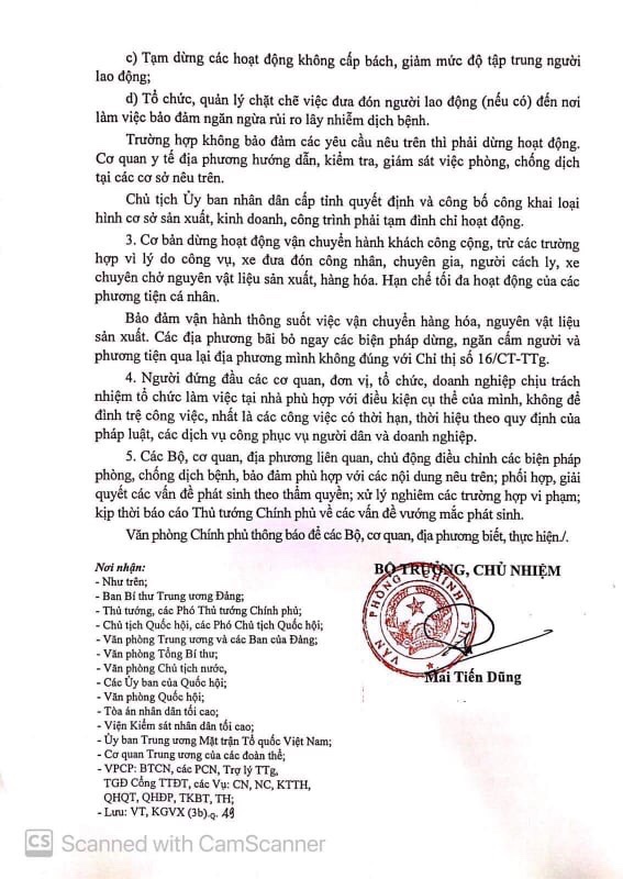Văn phòng chính phủ: công văn hoả tốc về thực hiện Chỉ thị 16 của Thủ tướng Chính phủ