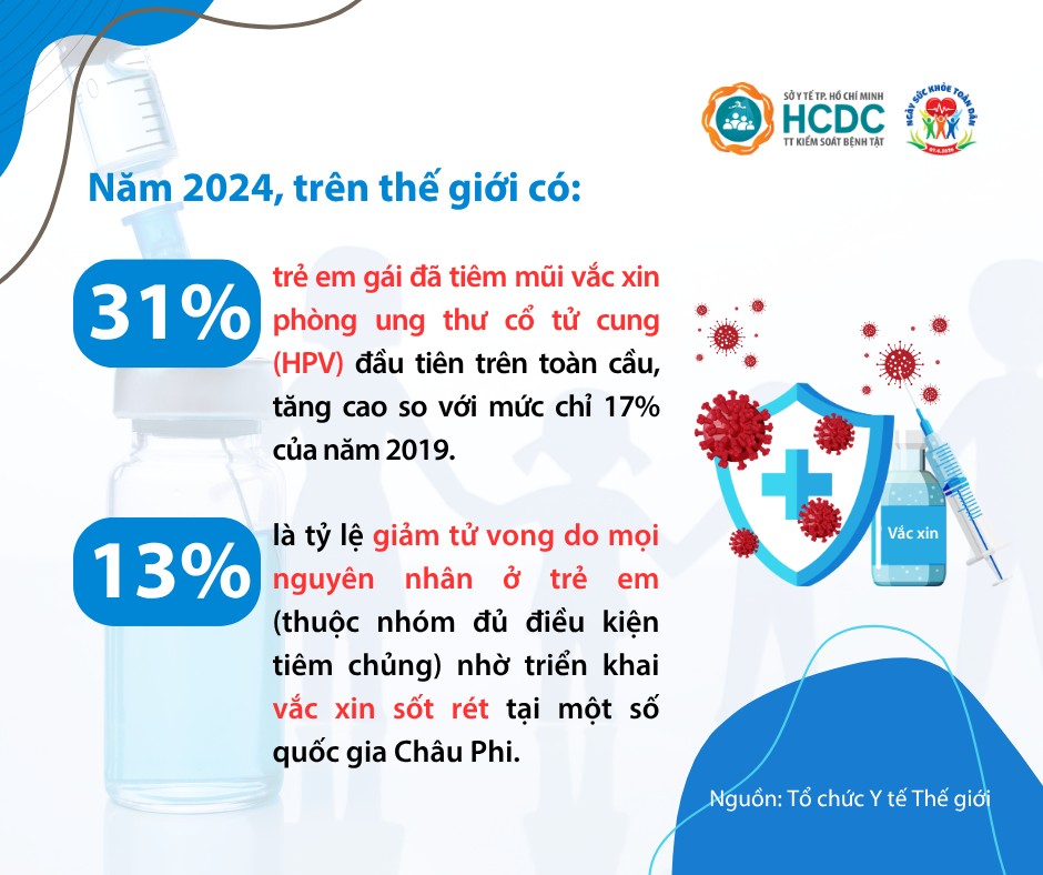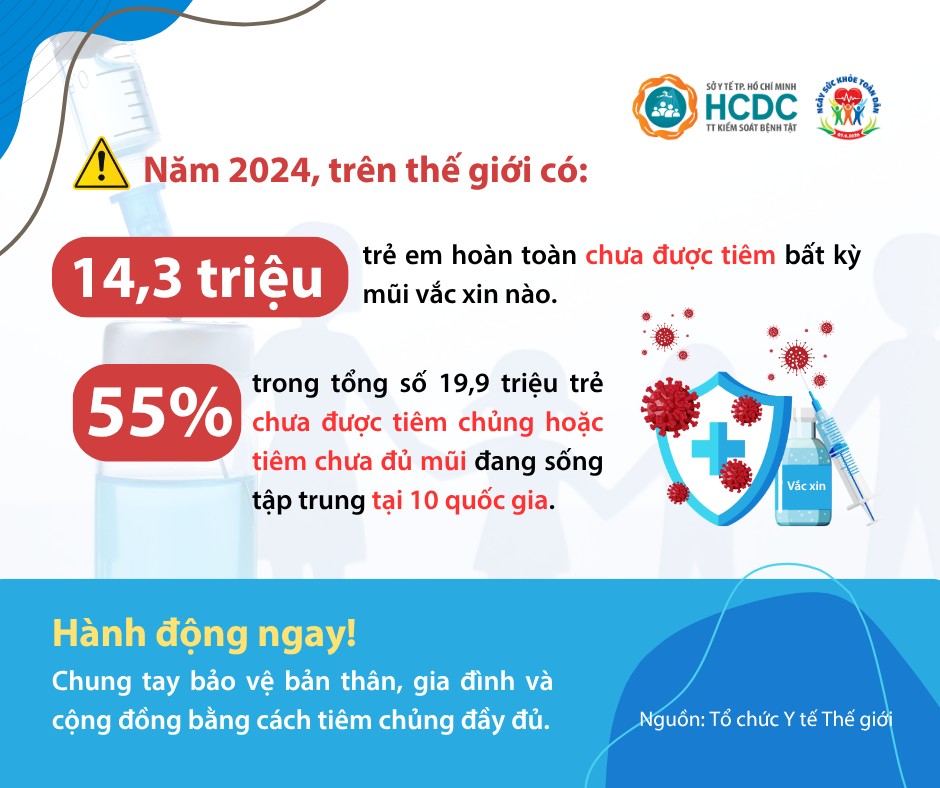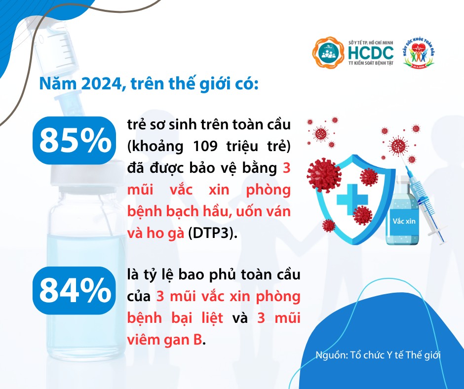 Tiêm chủng là chìa khóa để bảo vệ bản thân và gia đình khỏi những dịch bệnh nguy hiểm. Hưởng ứng Tuần lễ Tiêm chủng thế giới (24 - 30/4/2026), HCDC gửi đến bạn cái nhìn tổng quan về tình hình tiêm chủng vắc xin toàn cầu dựa trên nguồn dữ liệu từ Tổ chức Y tế Thế giới (WHO) năm 2024 nhé!