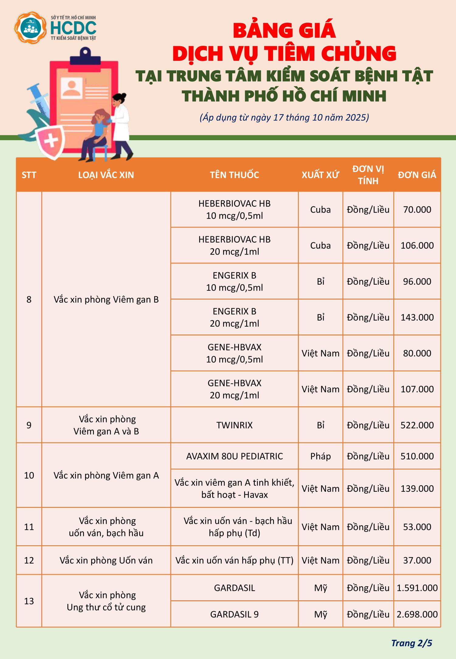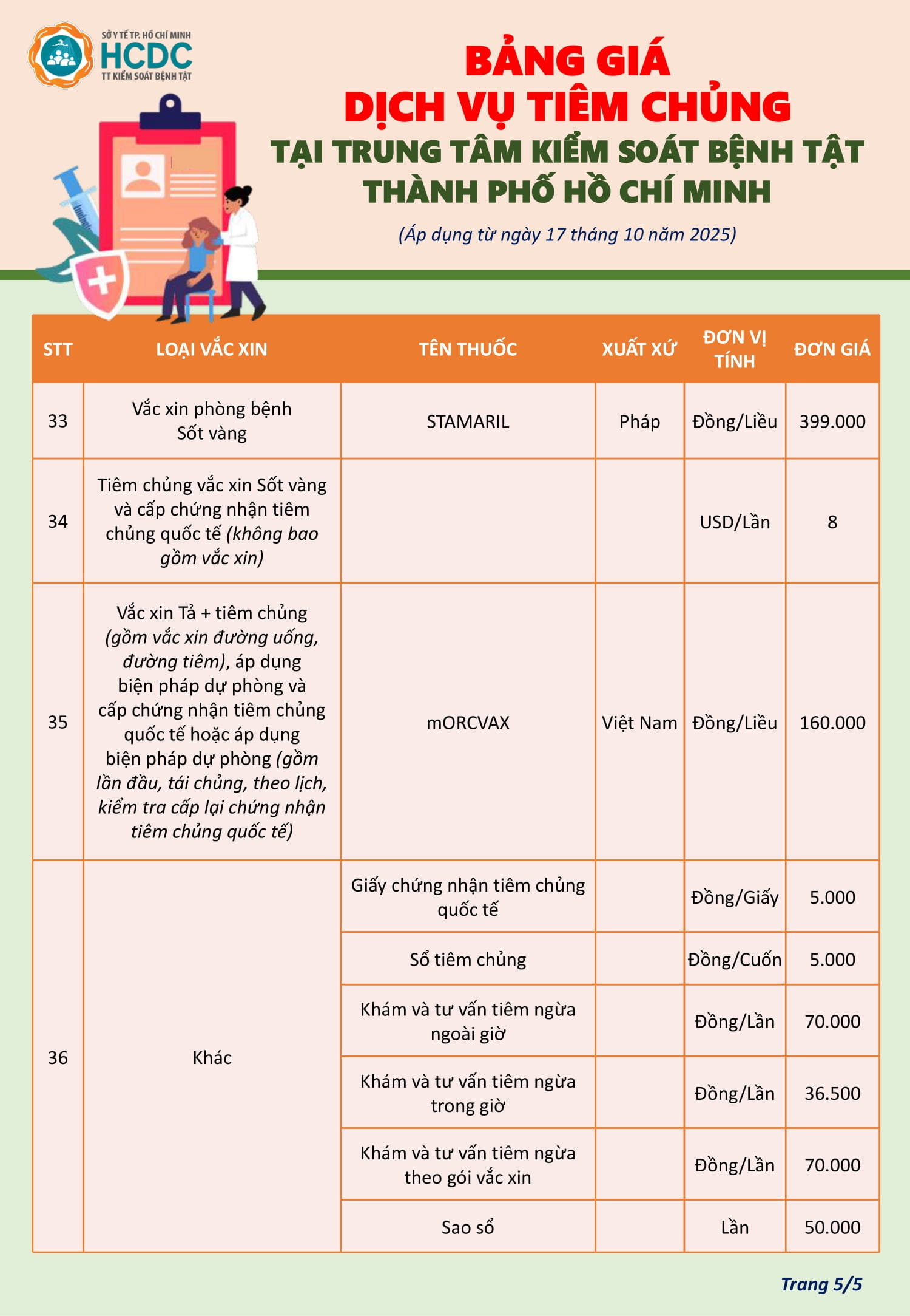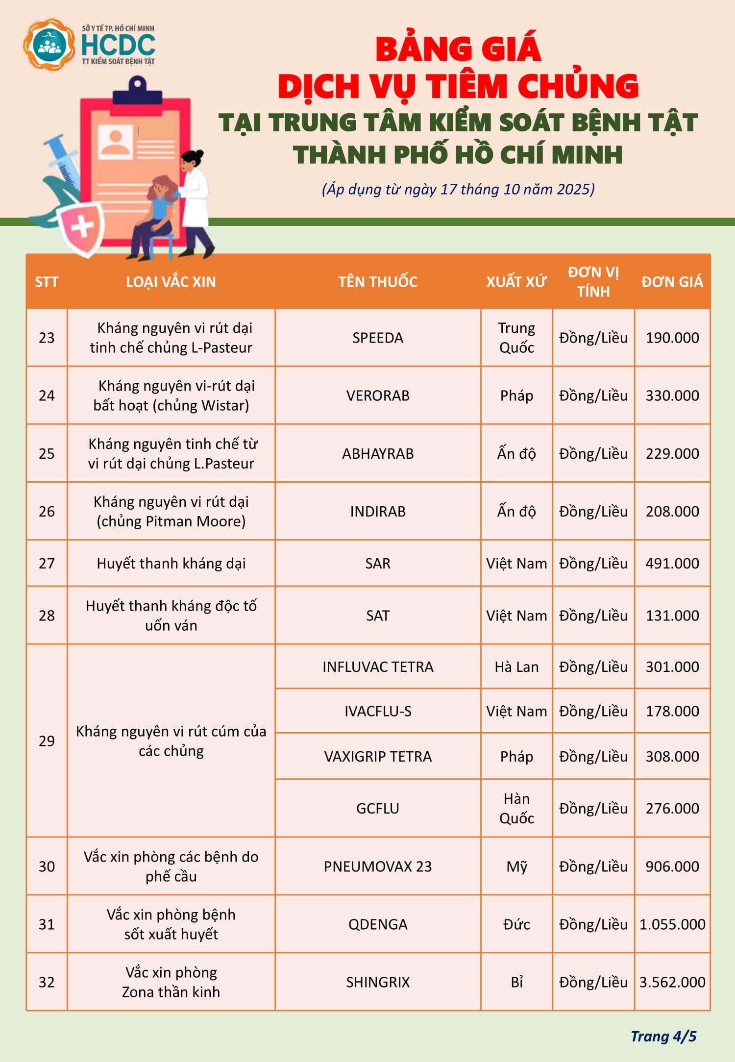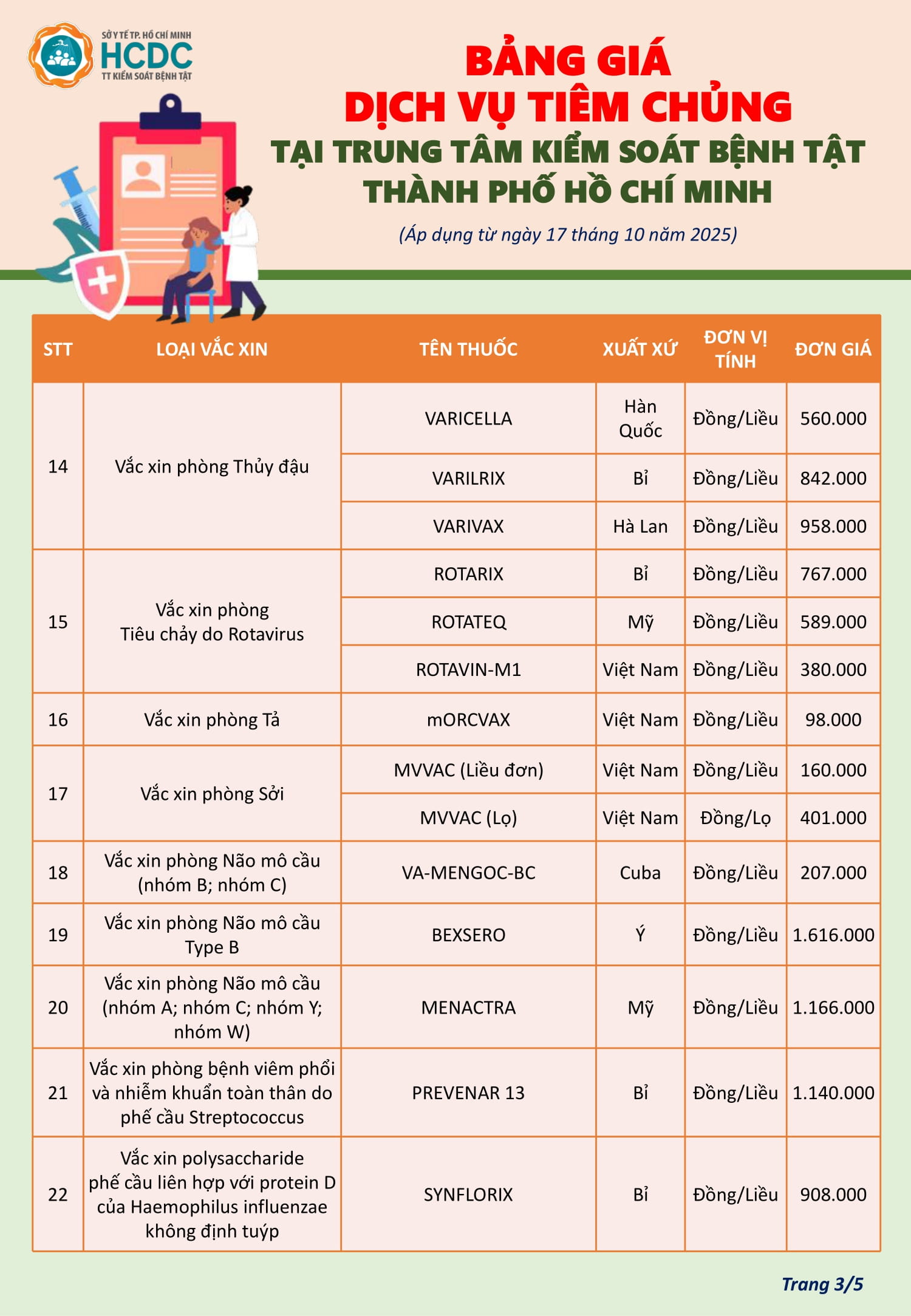 Bảng giá dịch vụ tiêm chủng tại Trung tâm Kiểm soát bệnh tật Thành phố Hồ Chí Minh