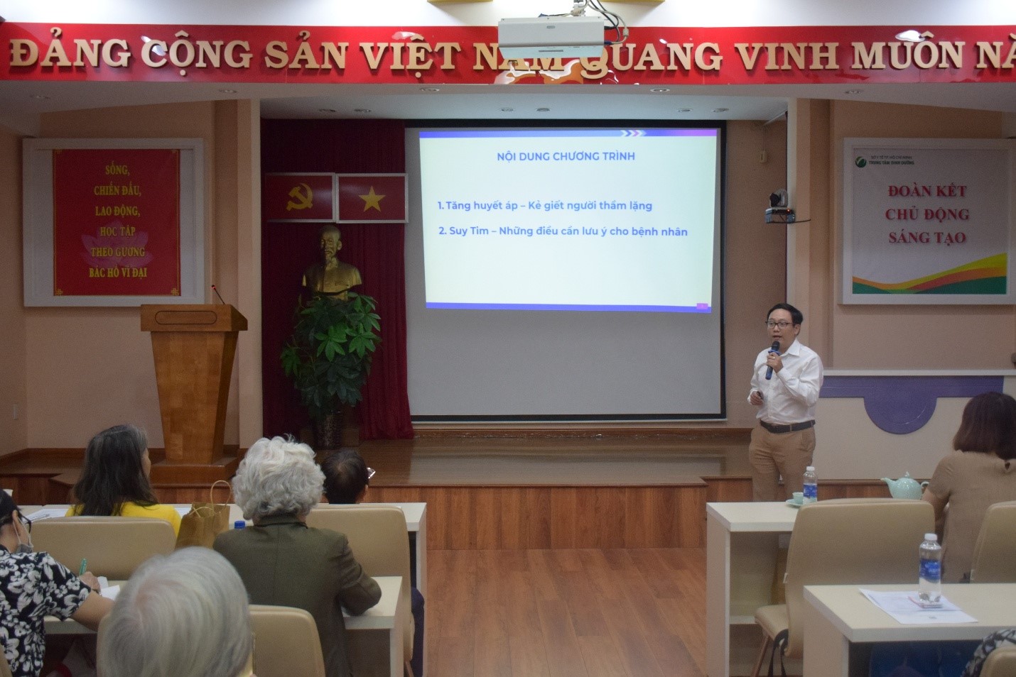 Ảnh: BS.CKII Nguyễn Vũ Đạt, Bệnh viện Nguyễn Tri Phương trình bày nội dung về tăng huyết áp và suy tim tại chương trình