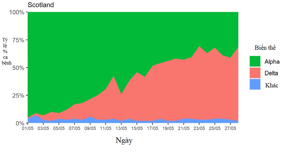 Vào ngày 19 tháng 5 năm 2021, Biến thể Delta, trước đây được gọi là biến thể Ấn Độ hoặc B 1.617.2, đã trở thành chủng vượt trội của SARS-CoV-2 Ở Scotland. Biến thể Alpha (trước đây được gọi là biến thể Kent, B.1.1.7, hoặc gen S âm tính) từng là chủng vượt trội, đã nhanh chóng bị thay thế (hình 1).