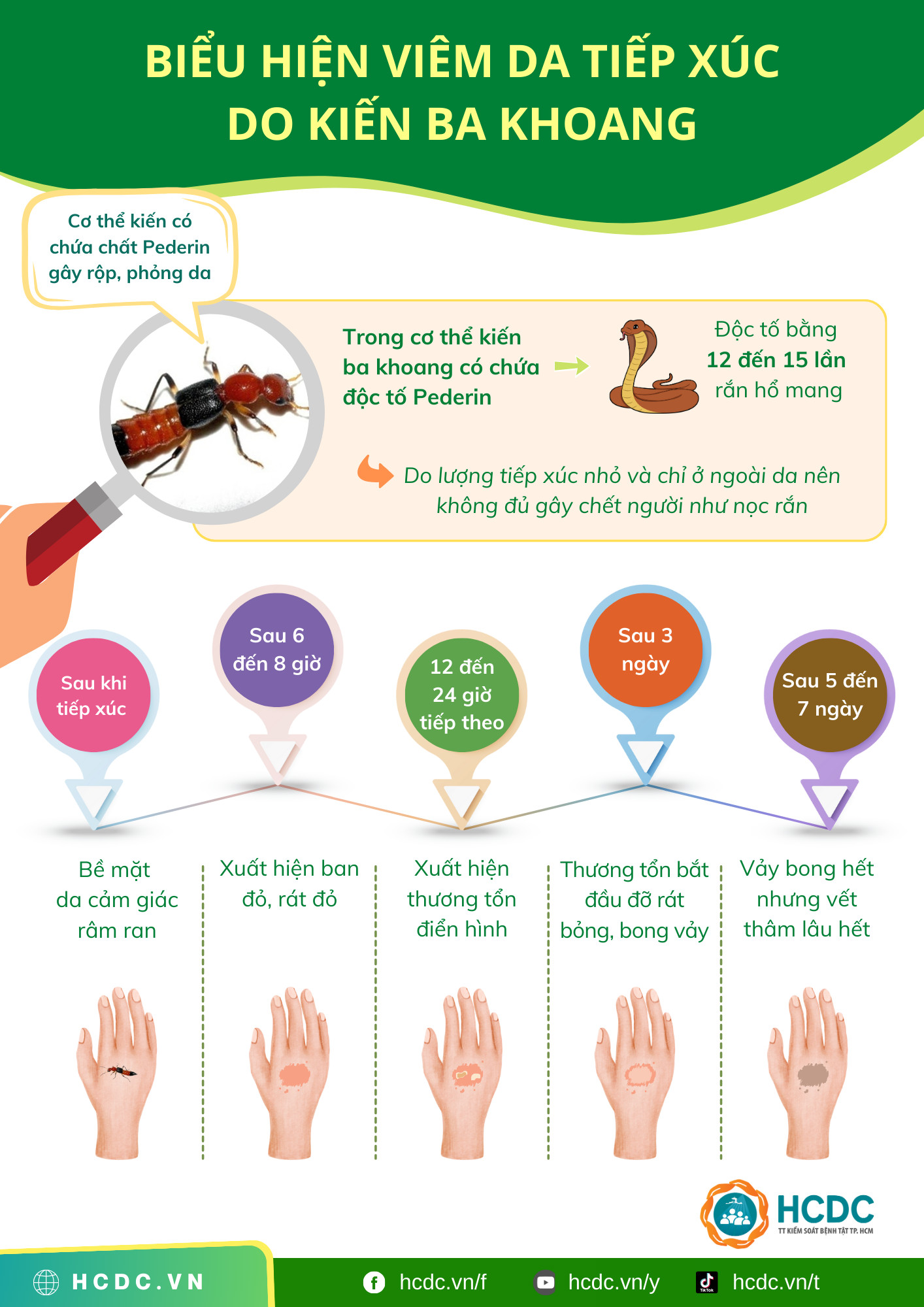 Kiến ba khoang thường bị thu hút bởi ánh sáng đèn, xâm nhập vào nhà sau đó đậu vào quần áo, giường chiếu, chăn màn. Quá trình sinh hoạt, người dân vô tình tiếp xúc, chất độc trong cơ thể kiến ba khoang nhả ra gây nên viêm, loét da. Bản chất kiến ba khoang là con vật hiền lành, chúng không cắn hoặc đốt chích người. Mặc dù là con vật hiền lành, tuy nhiên do cơ chế phòng thủ sinh học để chống lại các kẻ thù khác mà bên trong cơ thể kiến có chứa chất Pederin, một loại chất độc gây rộp, phỏng da. Chất Pederin không được kiến chủ động tiết ra mà nó chỉ tồn tại trong cơ thể kiến. Khi cơ thể chúng bị nghiền nát, chất này mới được giải phóng ra môi trường. Chất Pederin dính vào vùng da con người, nhất là vùng da non, vùng da nhạy cảm như: vùng mặt, cổ, cánh tay, bắp chân…thì các vùng da chỗ này sẽ bị phồng rộp, bỏng, đau rát. Một vài trường hợp khi bị dính Pederin sẽ gây viêm da, và nếu không chăm sóc tốt vết thương thì có thể gây nhiễm trùng và tình trạng vết thương trở nặng hơn. Nhìn sơ, hình dạng vết thương rất giống với vết phồng rộp do bệnh Zona (giời leo). Vì vậy, khi thấy cơ thể xuất hiện các vết phòng rộp trên da cần nhanh chóng đên các cơ sở y tế để nhân viên y tế chuẩn đoán và có giải pháp xử lý thích hợp.