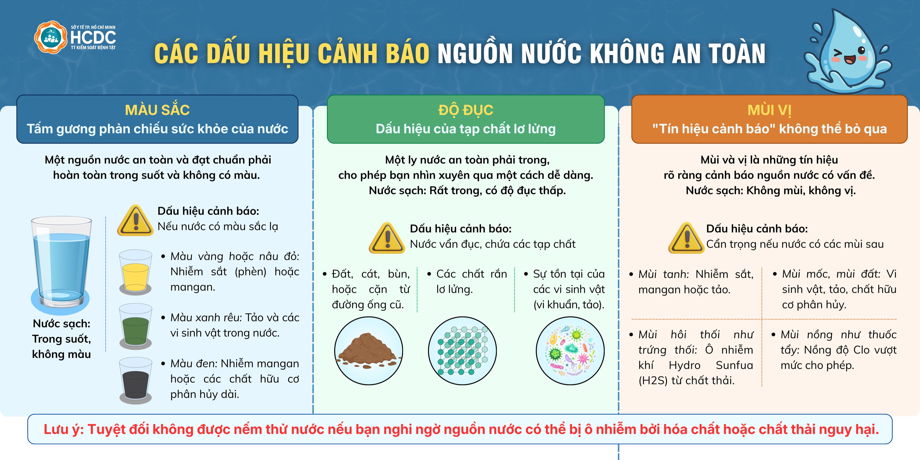 Infographic dưới đây giúp nhận biết các dấu hiệu phổ biến của nguồn nước không an toàn, từ đó giúp mỗi người chủ động kiểm tra và có biện pháp xử lý phù hợp trước khi sử dụng, góp phần bảo vệ sức khỏe cho bản thân và gia đình.