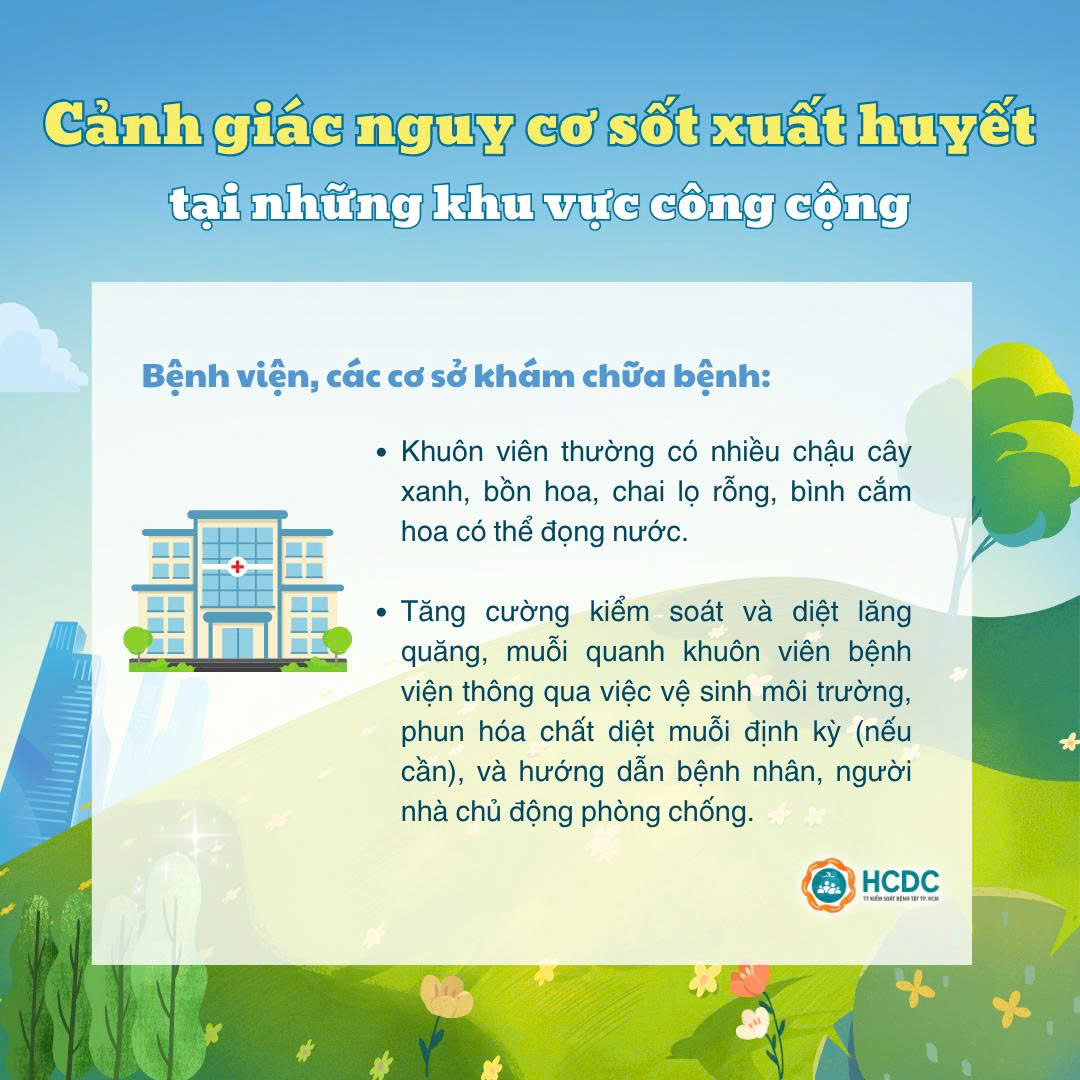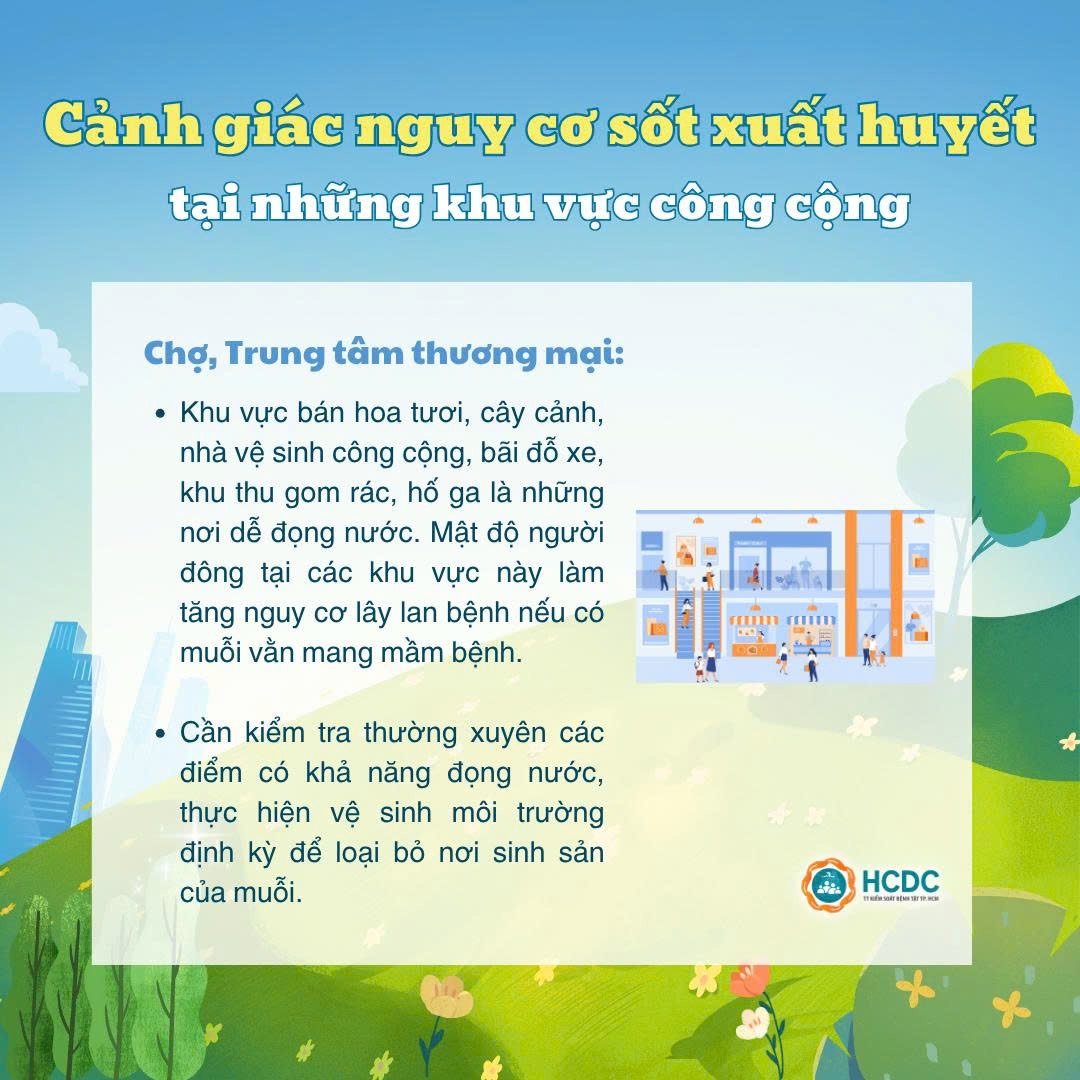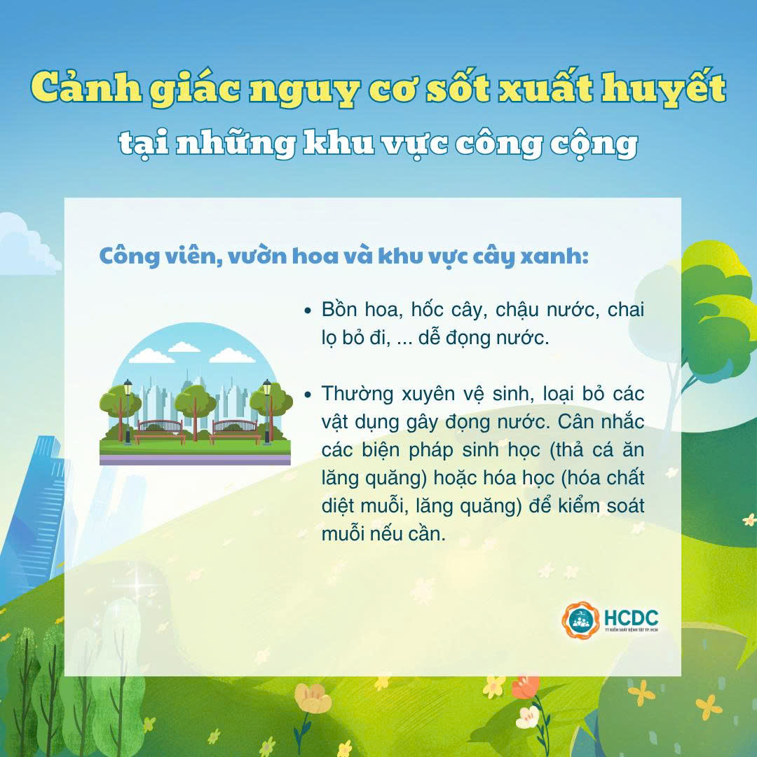 Bên cạnh đó, những khu vực công cộng cũng là những điểm nguy cơ có thể phát sinh lăng quăng gây bệnh sốt xuất huyết. Hãy cùng HCDC điểm qua các khu vực công cộng mà chúng ta cần đặc biệt lưu ý để phòng tránh dịch bệnh nhé!