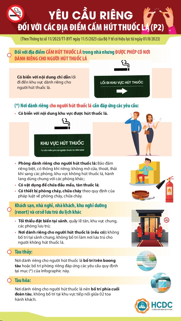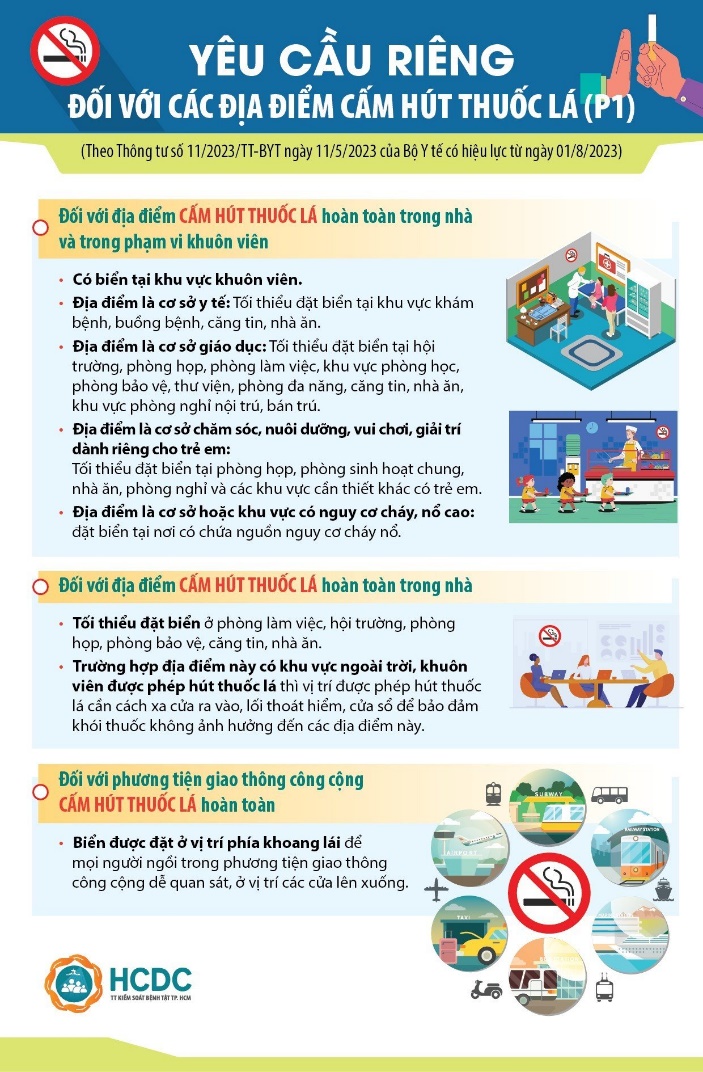 Theo đó, đối với tất cả địa điểm cấm hút thuốc lá yêu cầu phải có đặt, in, bố trí biển hoặc chữ hoặc biểu tượng với nội dung cấm hút thuốc lá. Đảm bảo không có gạt tàn, dụng cụ dùng cho hút thuốc, đầu mẩu và tàn thuốc lá tại địa điểm cấm hút thuốc lá.