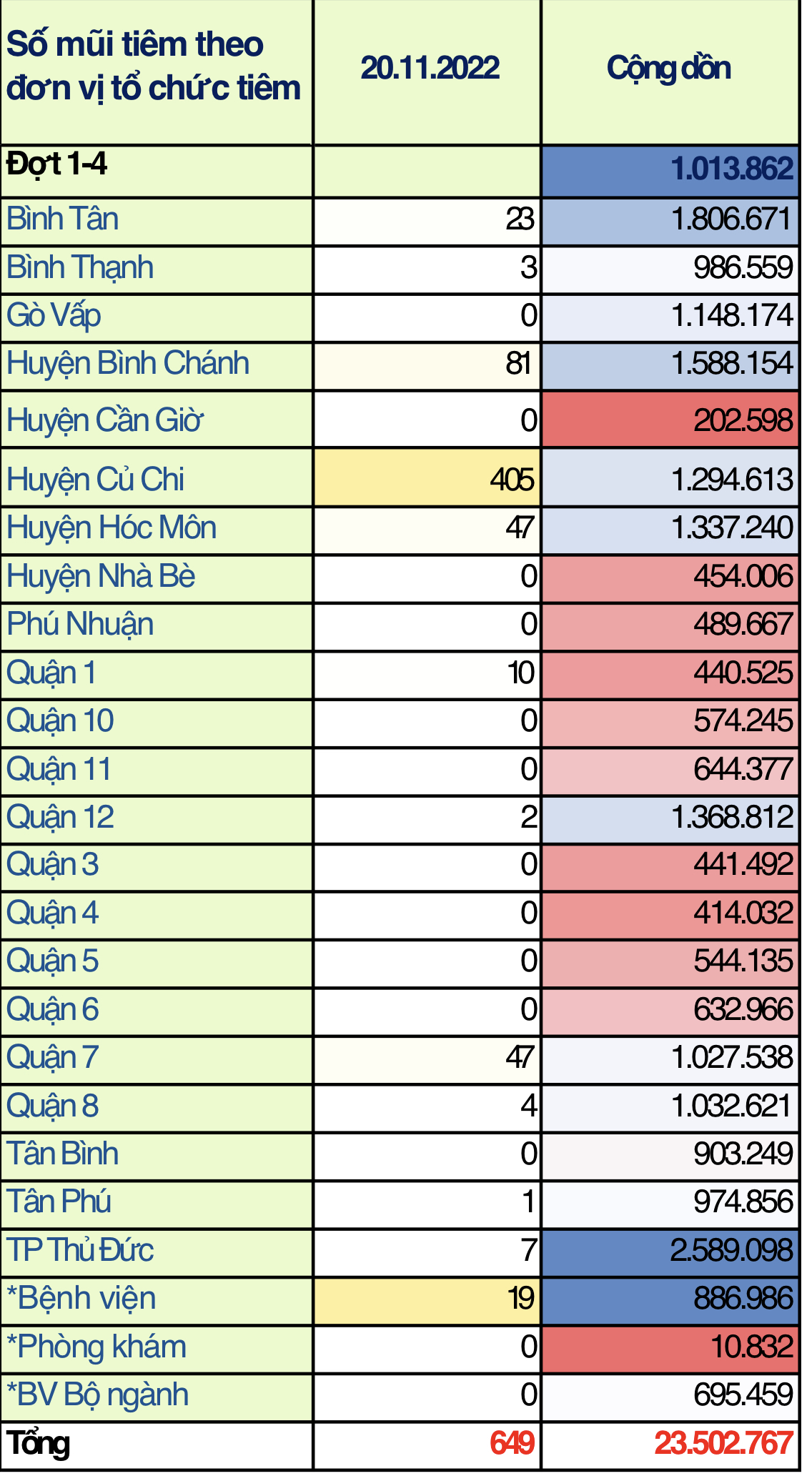Tính đến hết ngày 20/11/2022 toàn Thành phố đã tiêm được 23.502.767 mũi (bao gồm 8.694.302 mũi 1; 7.752.049 mũi 2; 683.189 mũi bổ sung; 4.833.277 mũi nhắc lần 1; 1.539.950 mũi nhắc lần 2).