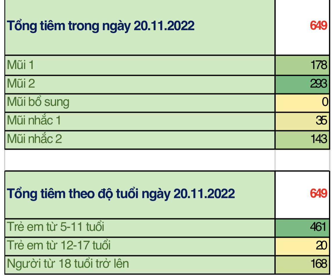 Trong ngày 20/11/2022 toàn thành phố đã tiêm được 649 mũi tiêm, bao gồm 178 mũi 1; 293 mũi 2; 0 mũi bổ sung; 35 mũi nhắc lần 1; 143 mũi nhắc lần 2 tại 33 điểm tiêm. Trong đó: người từ 18 tuổi trở lên đã tiêm được 168 mũi (26%); trẻ từ 12 đến dưới 18 tuổi: đã tiêm được 20 mũi (3%); trẻ từ 05 đến dưới 12 tuổi: đã tiêm được 461 mũi (71%), tăng hơn 3 lần so với số lượng tiêm ngày 18/11/2022.